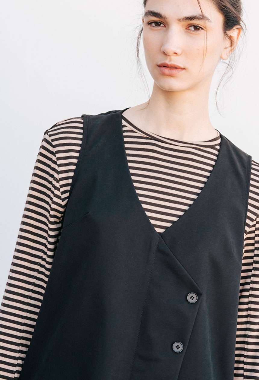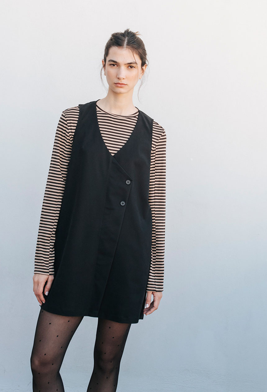 Αμάνικο φόρεμα με V λαιμόκοψη και λεπτομέρειες με κουμπιά μπροστά.