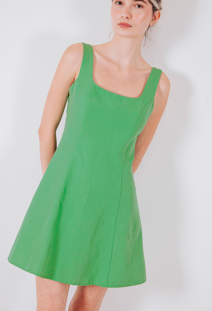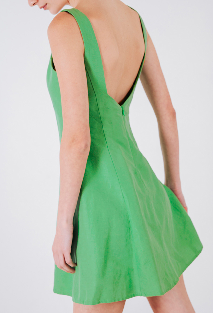 Αμάνικο μίνι φόρεμα από λινό και βαμβάκι με ανοιχτή πλάτη, κλείσιμο πίσω με κρυφό φερμουάρ.