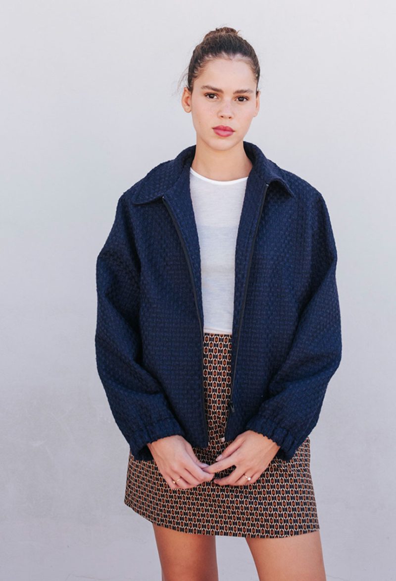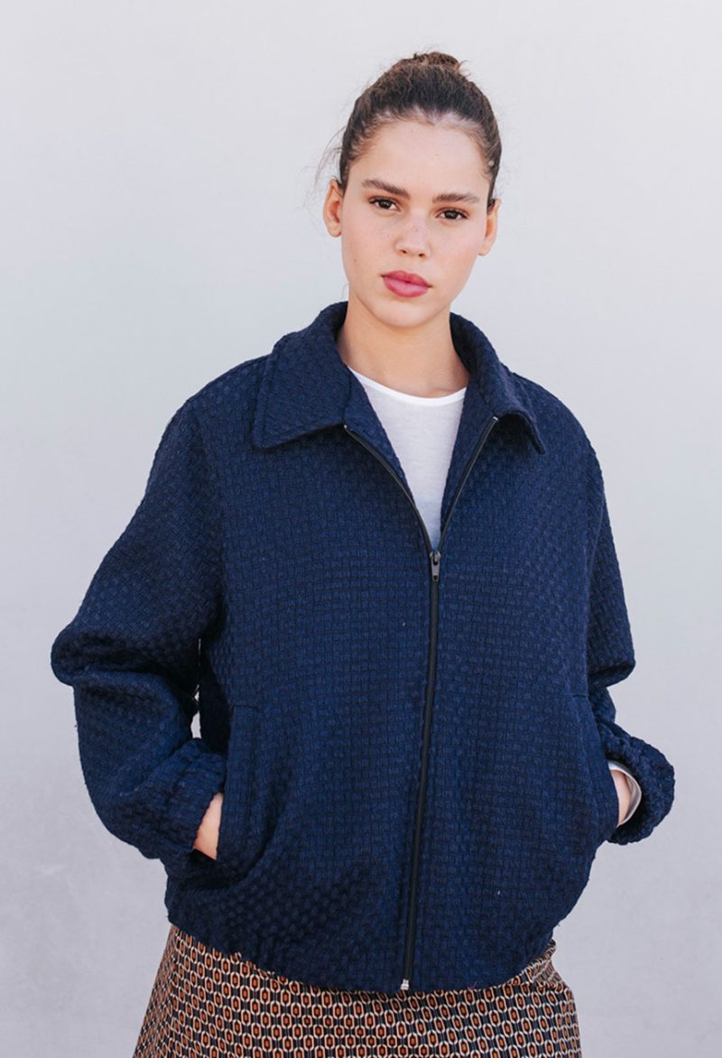 Bomber τζάκετ με γιακά, λάστιχο στο τελείωμα και στα μανίκια, κλείσιμο μπροστά με φερμουάρ και τσέπες στο πλάι.