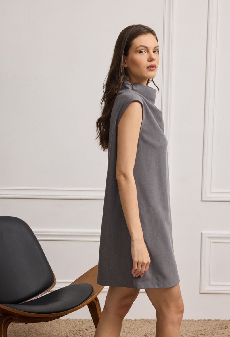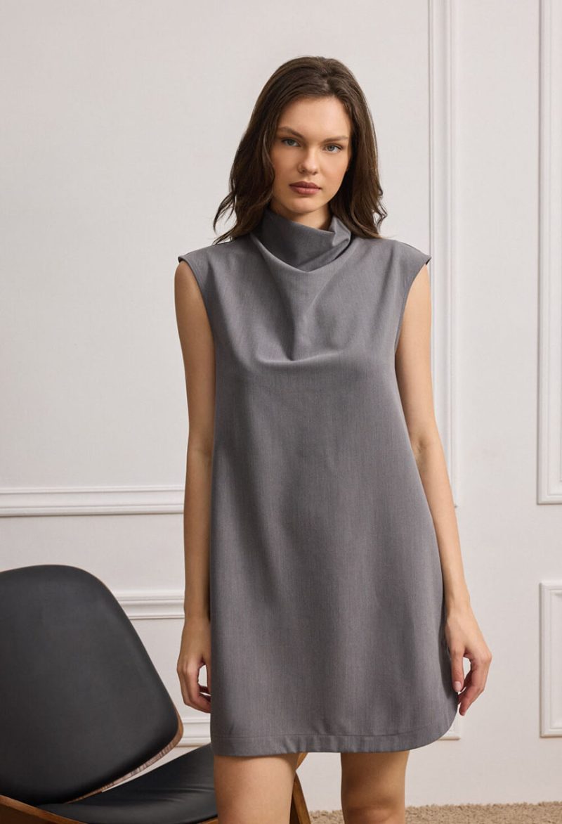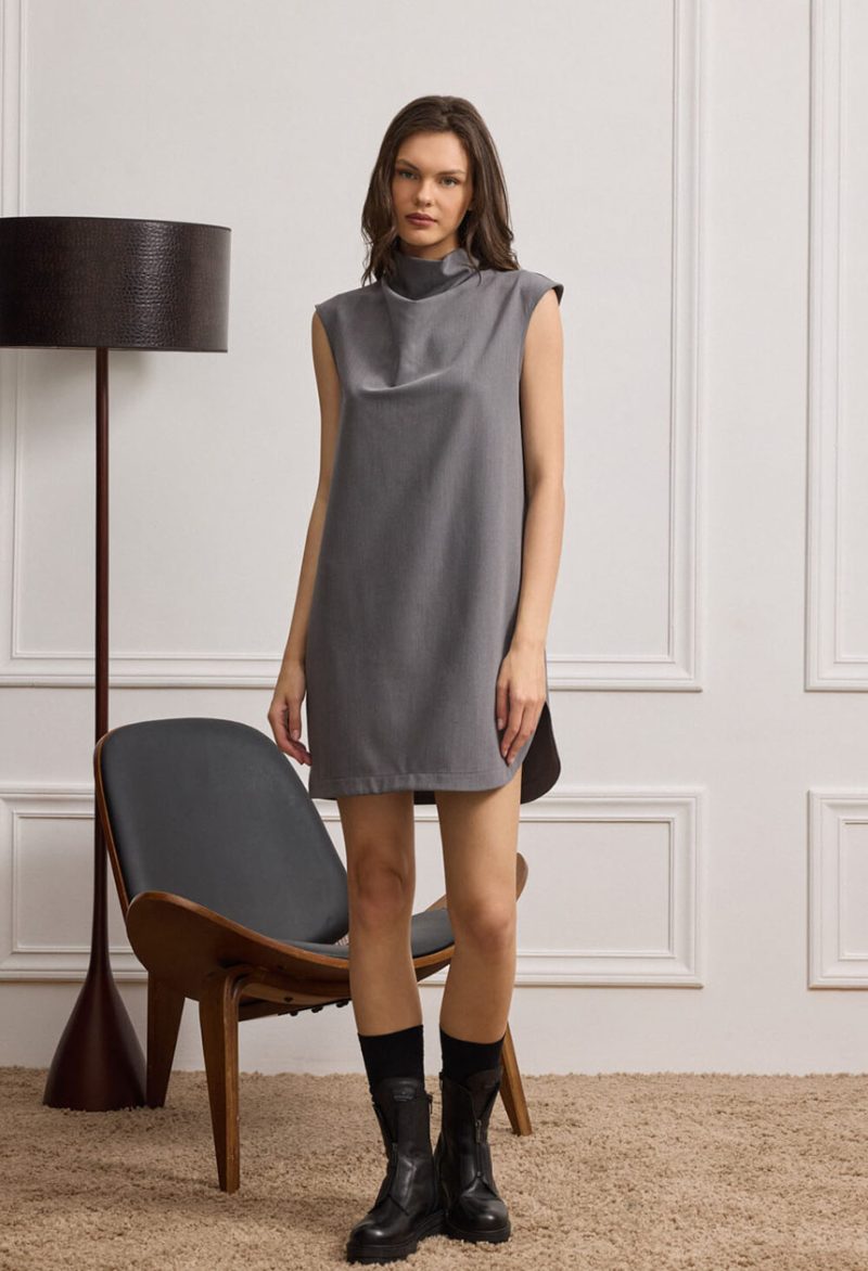 Mini φόρεμα αμάνικο σε ίσια γραμμή, ντραπέ γιακάς, στρογγυλεμένο τελείωμα με μικρό άνοιγμα στην αριστερή πλευρά. Κλείνει στην πλάτη με αόρατο φερμουάρ.