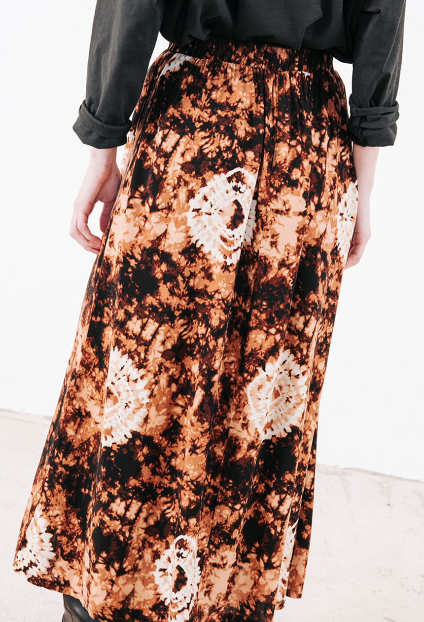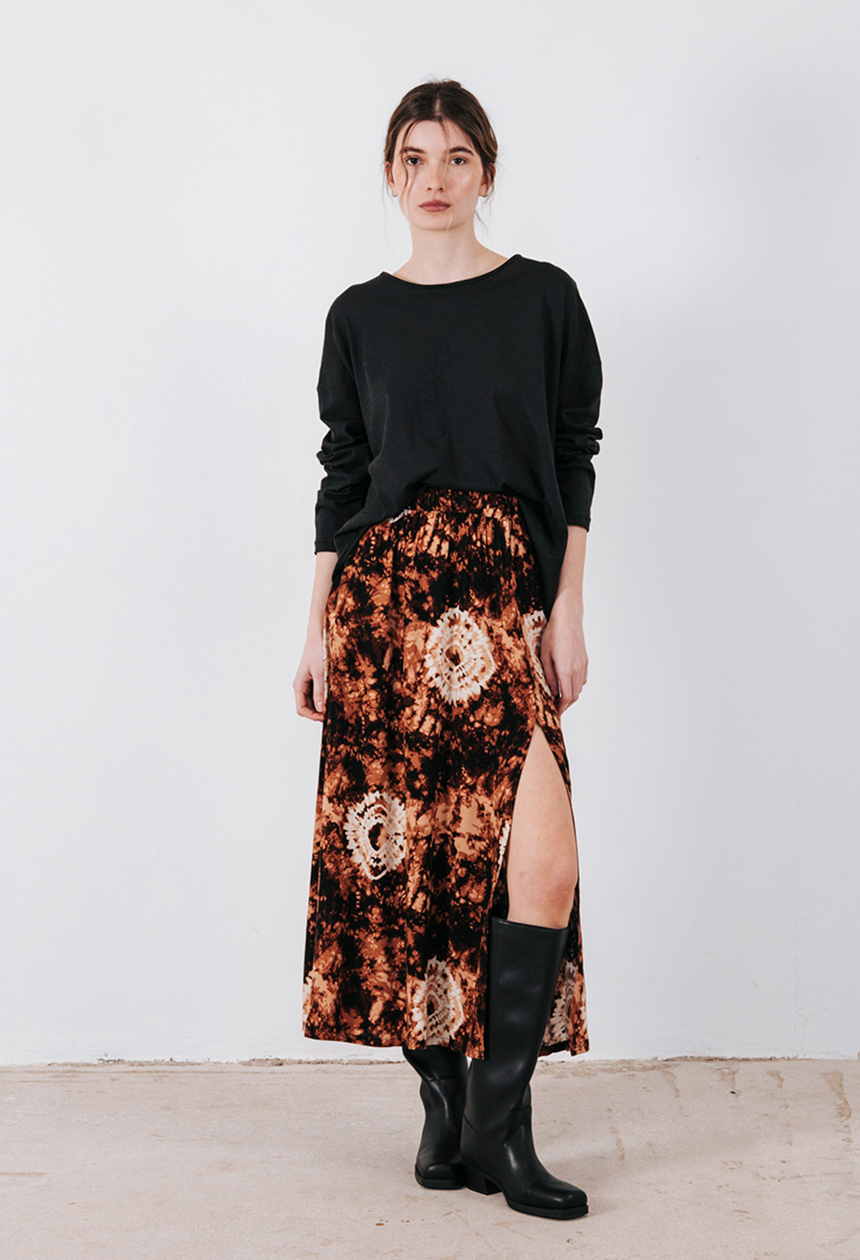 Εμπριμέ φούστα με λάστιχο στη μέση και άνοιγμα μπροστά.