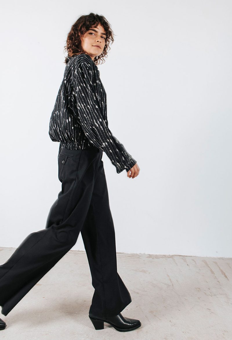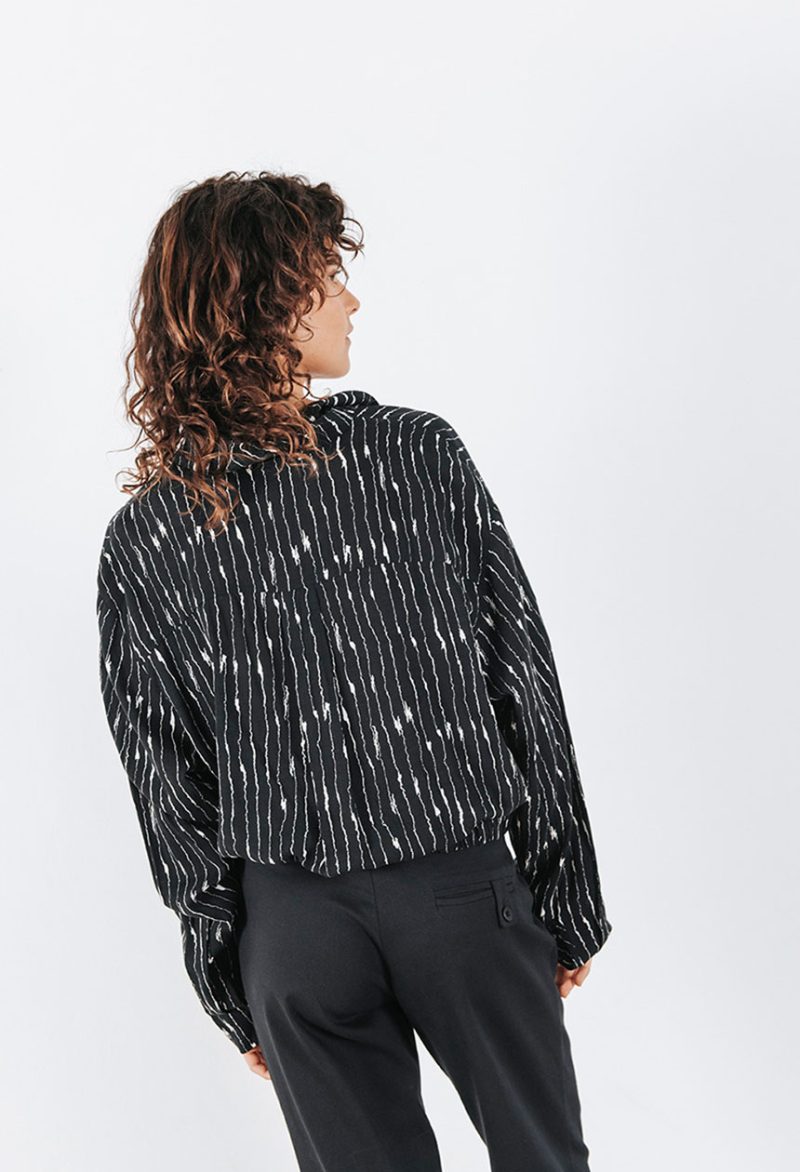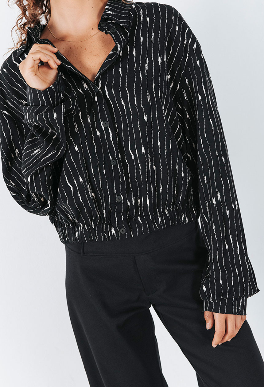 Εμπριμέ πουκάμισο με γιακά, λάστιχο στο κάτω μέρος και κλείσιμο μπροστά με κουμπιά.