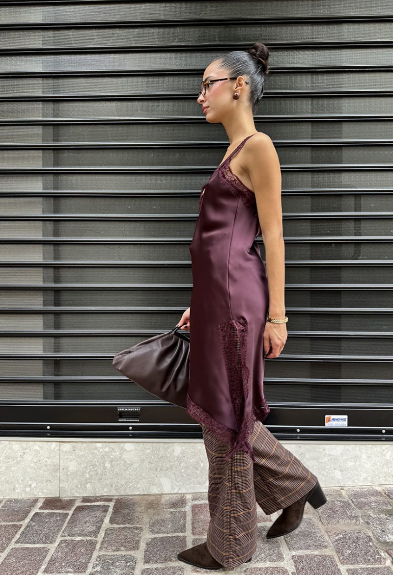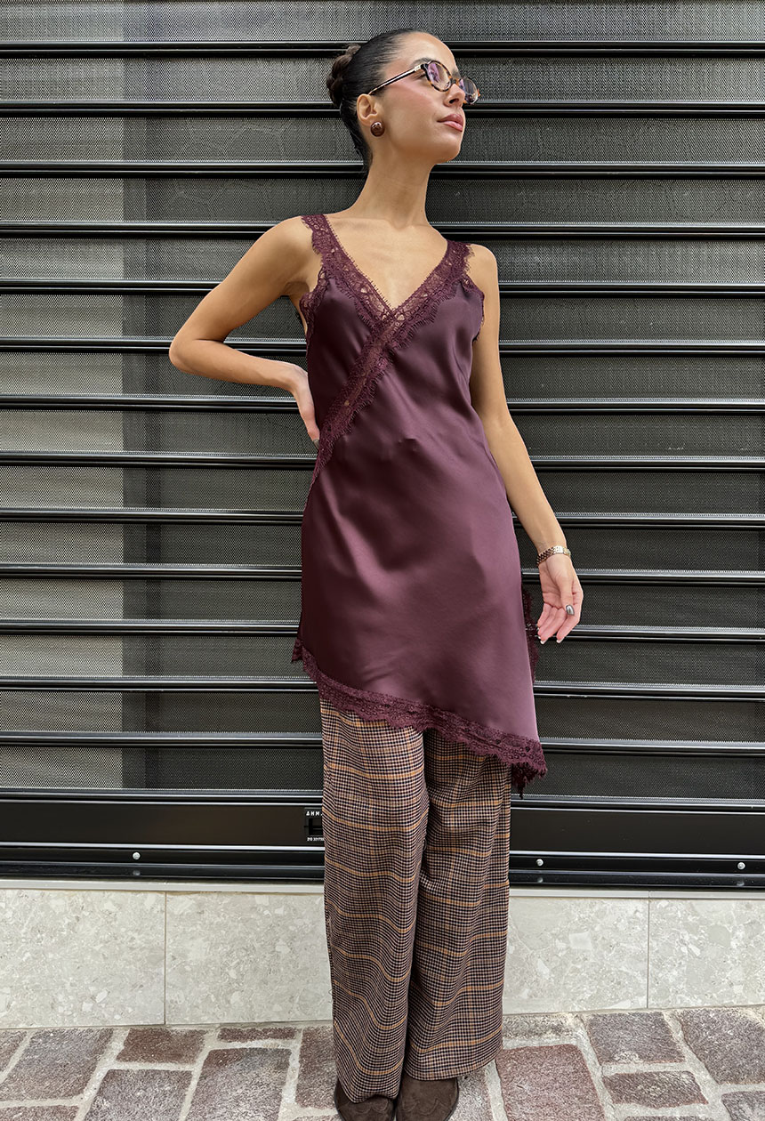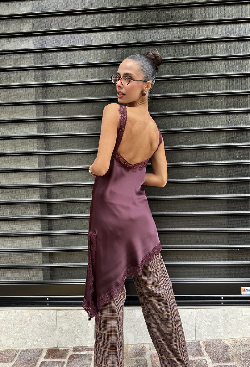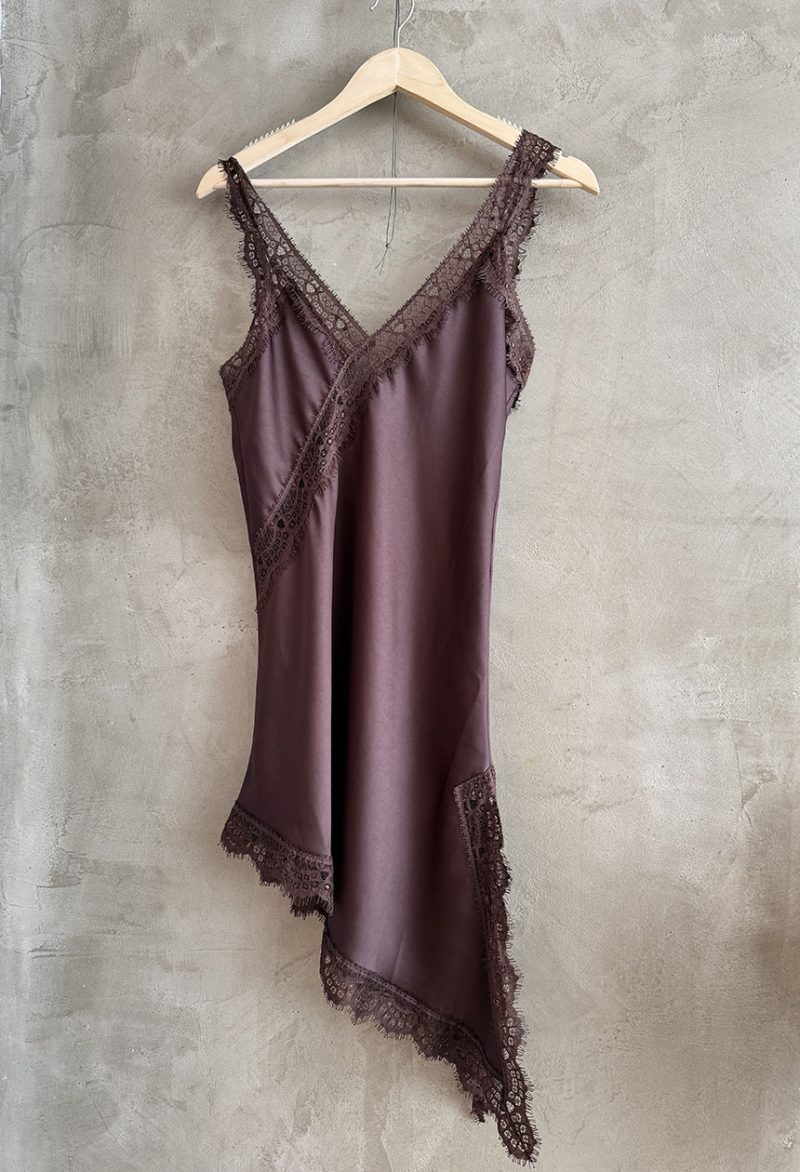 Φόρεμα σατέν lingerie,ασύμμετρο με μικρό σκίσιμο στο πλάι,V μπούστο,ανοικτή πλάτη,δαντέλα περιμετρικά δίνοντας αίσθηση θηλυκότητας.