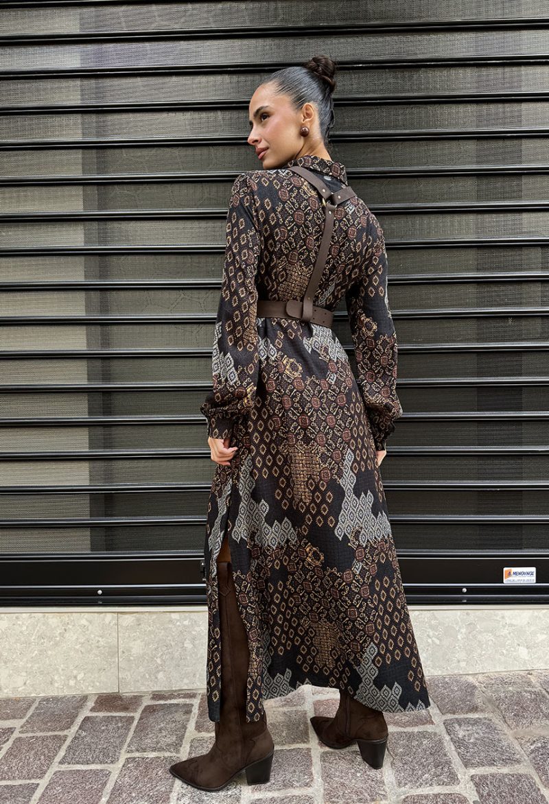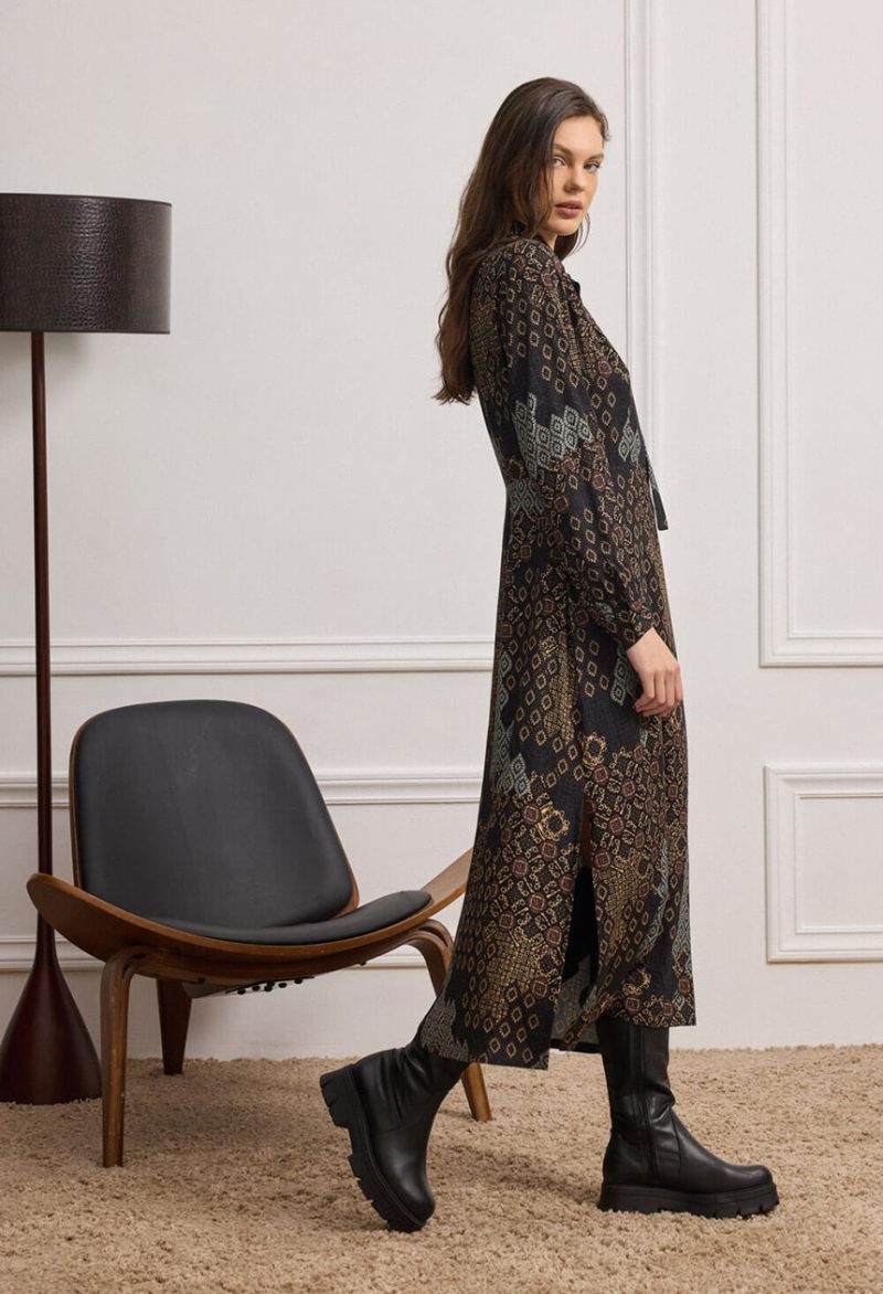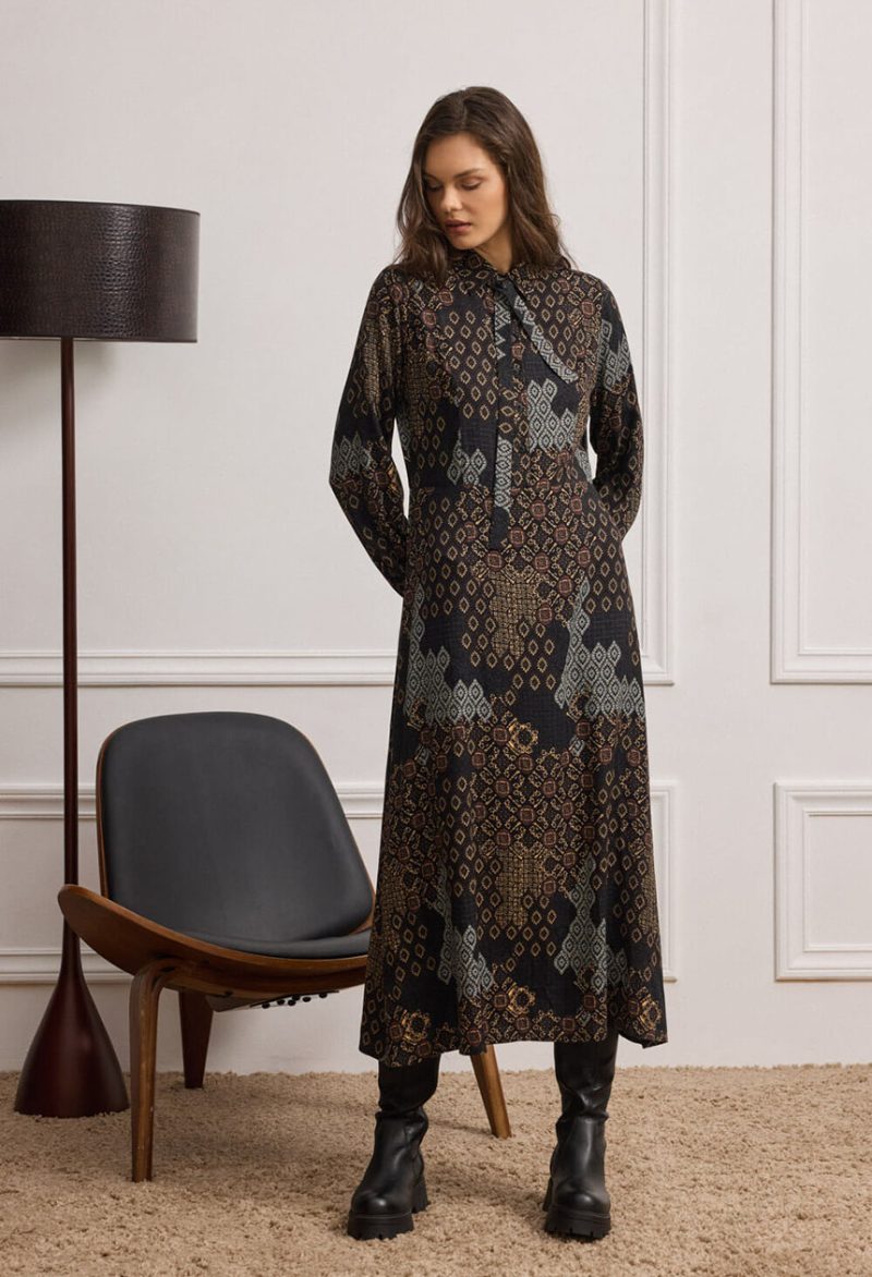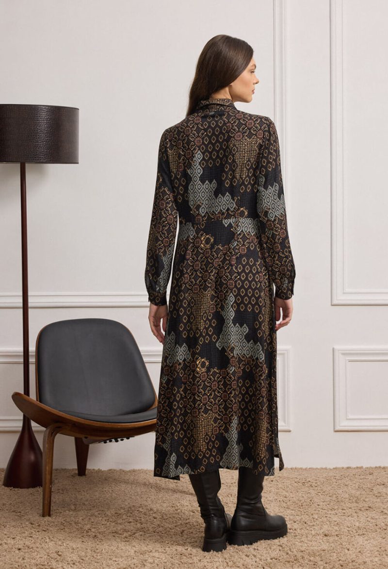 Μακρύ φόρεμα με ethnic μοτίβο δημιουργεί δυναμική εικόνα και ξεχωριστές λεπτομέρειες, σε ίσια γραμμή που αναδεικνύει τη σιλουέτα με διακριτική κομψότητα. Κατασκευασμένο από 100% viscose, προσφέρει απαλή υφή, ενώ ο γιακάς τύπου πουκαμίσου και η πατιλέτα μπροστά με κουμπιά τονίζουν τη δομημένη αισθητική του φορέματος.Τα μακριά μανίκια καταλήγουν σε μανσέτες που κλείνουν με κουμπί και έχει πλαϊνά ανοίγματα στο τελείωμα. Ιδιαίτερη σχεδιαστική λεπτομέρεια, η αποσπώμενη “γραβάτα” από το ίδιο ύφασμα που δένει στον λαιμό και στερεώνεται με κουμπί, προσθέτοντας μοντέρνο twist στην κλασική γραμμή.