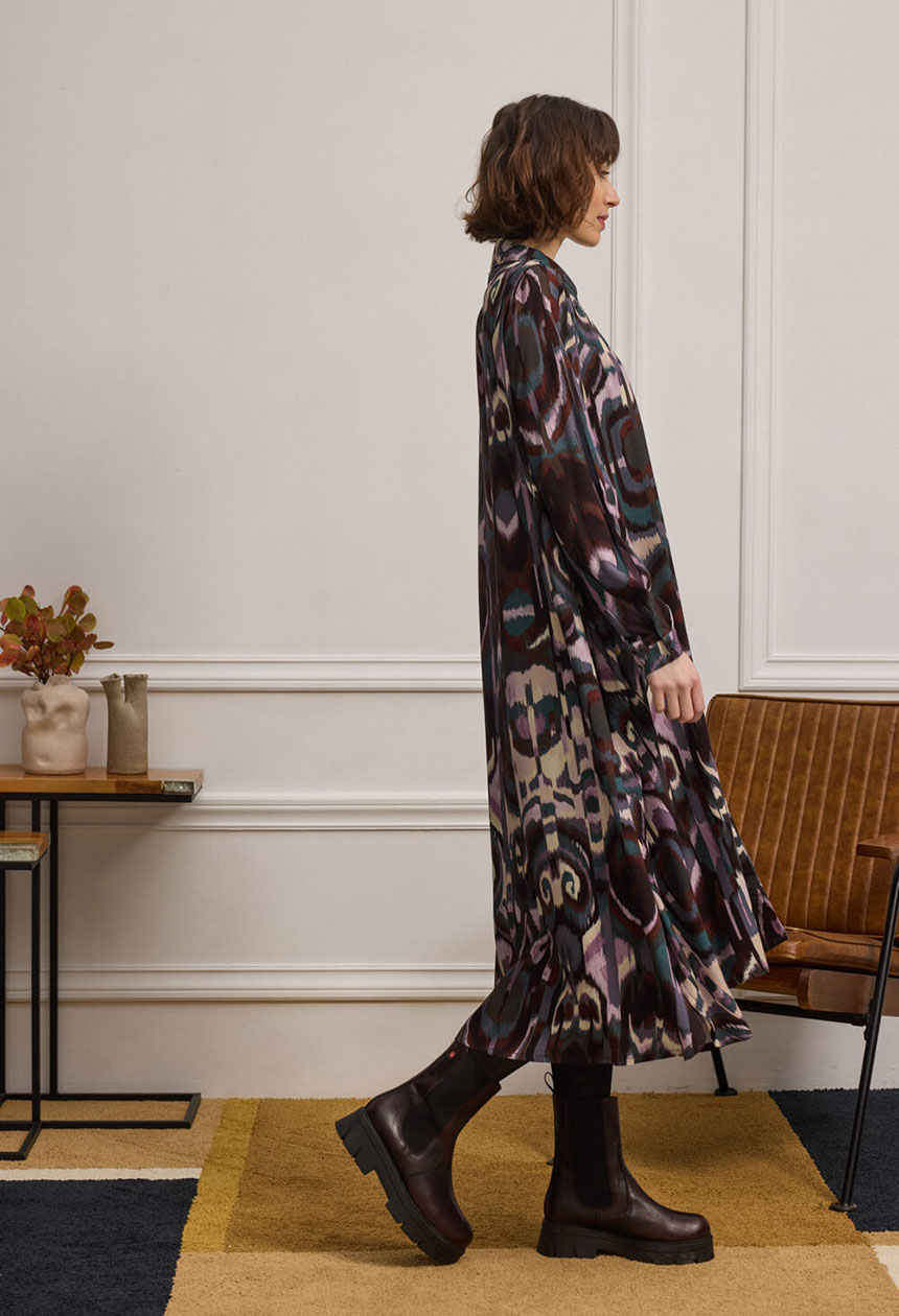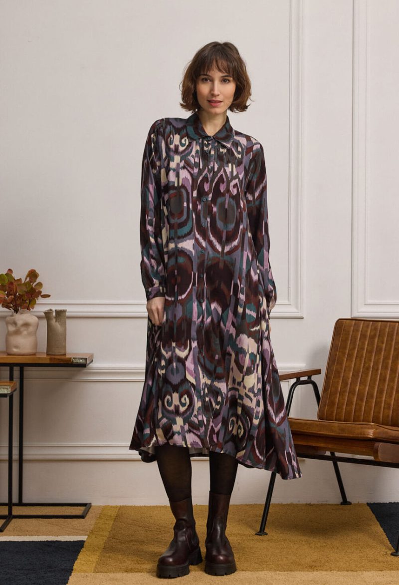 Midi φόρεμα με γιακά και κουμπιά σε όλο το μήκος, μακριά μανίκια που κλείνουν με κουμπί, ενώ τα ανοίγματα στα πλάγια δημιουργούν ένα σχεδιαστικό στίγμα. Στο πίσω μέρος, ο ωμίτης και η κουφόπιετα ολοκληρώνουν το σχέδιο, δίνοντας μια λεπτή, διακριτική αισθητική. Από 100% EcoVero βισκόζη, προσφέρει απαλή αίσθηση και περιβαλλοντική ευαισθησία, ενώ το αφηρημένο print προσθέτει ζωντάνια και μοναδικότητα σε κάθε εμφάνιση.