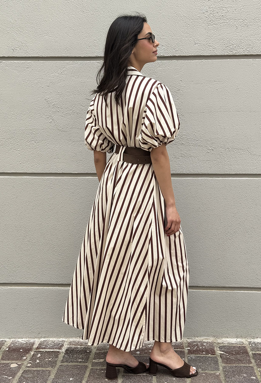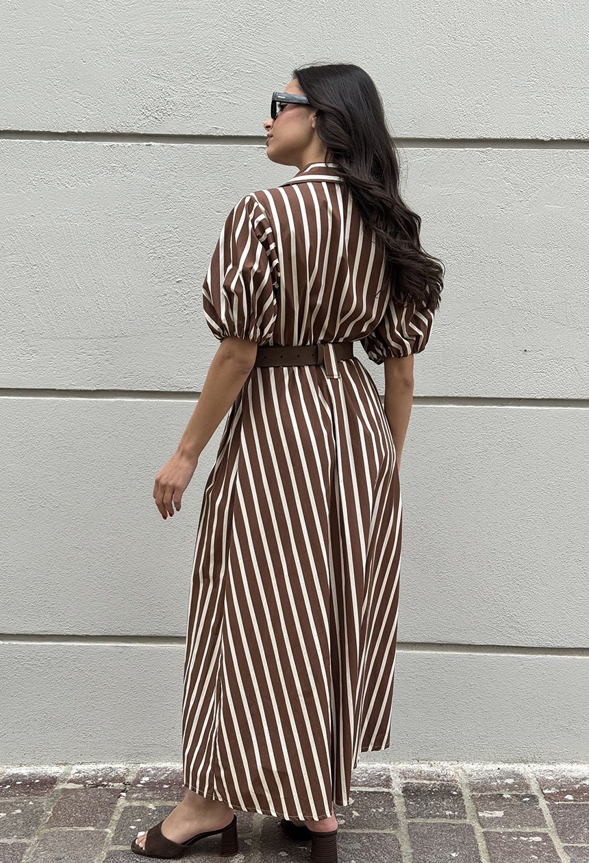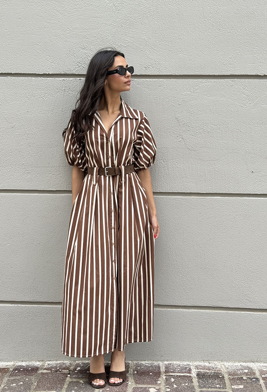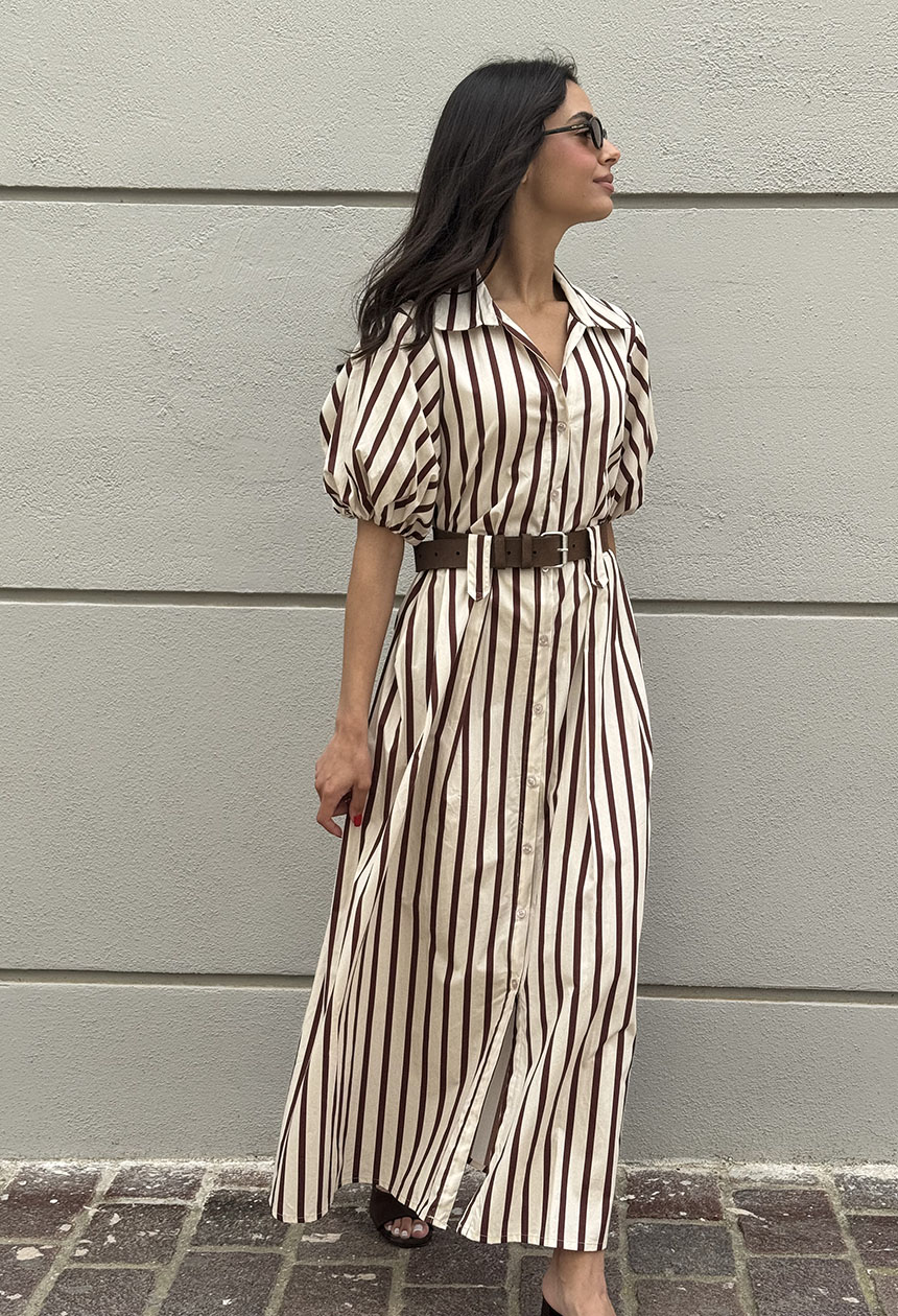 Φόρεμα μακρύ με ριγέ σχέδιο,γιακάς,κλείνει κατά μήκος με κουμπιά,όμορφες θηλές για ζώνη,ιδιαίτερο κοντό μανίκι balloon .