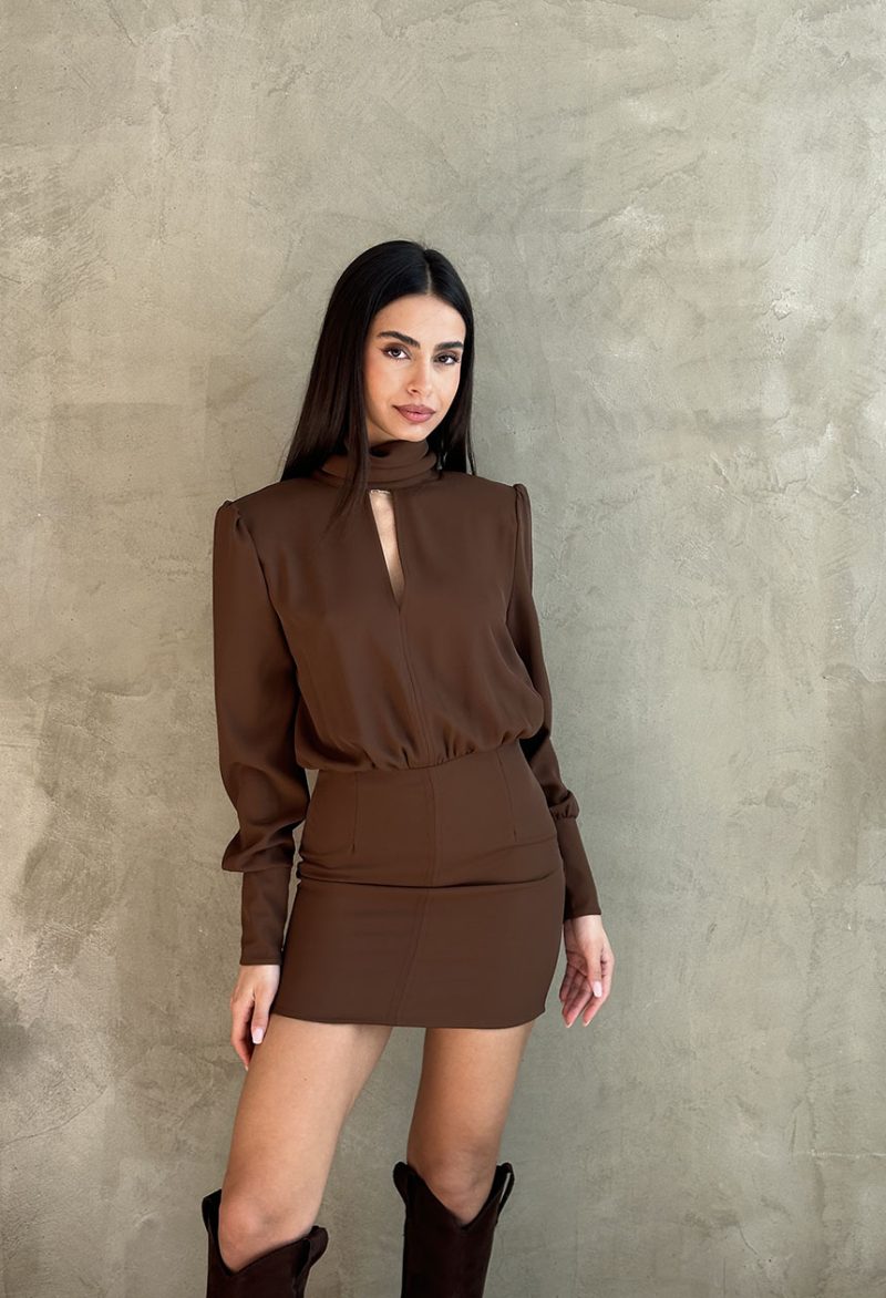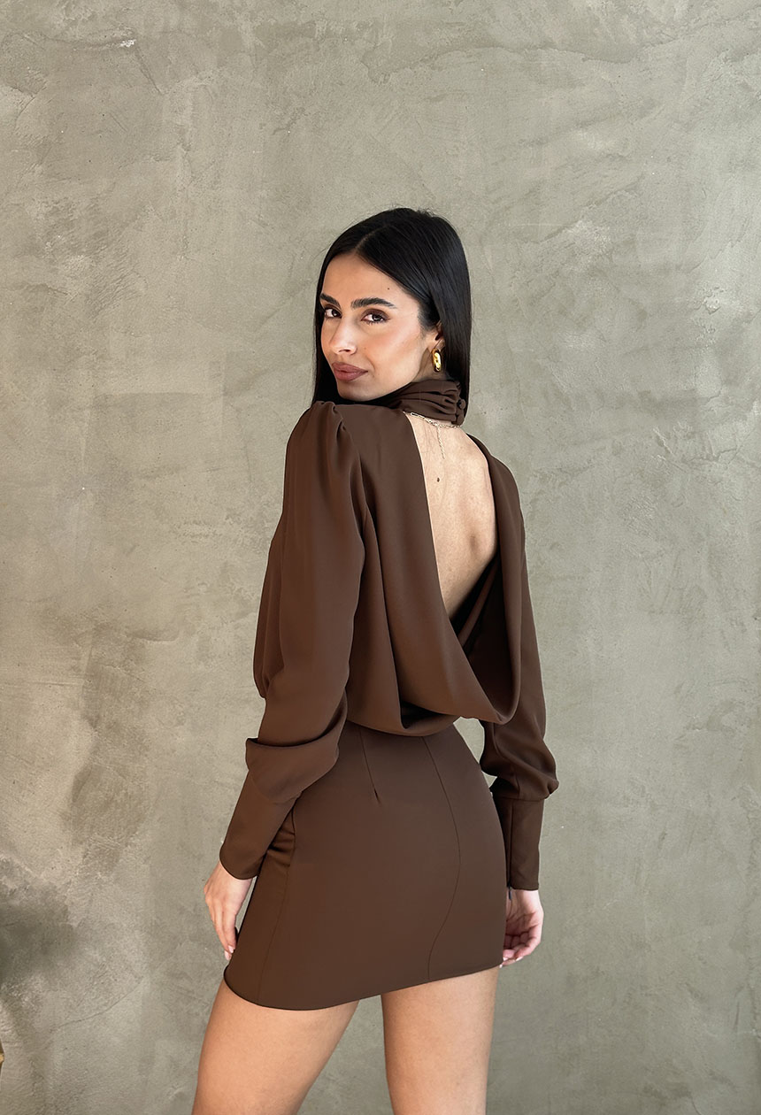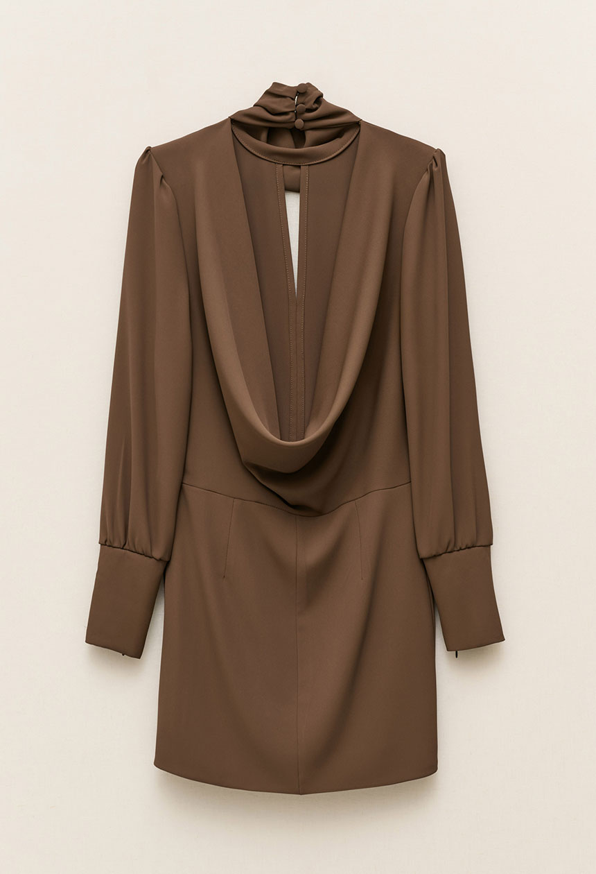 Φόρεμα μίνι με ψηλό λαιμό,άνοιγμα στο ντεκολτέ,ανοικτή ντραπέ πλάτη,μακρύ μανίκι,λεπτές βάτες.