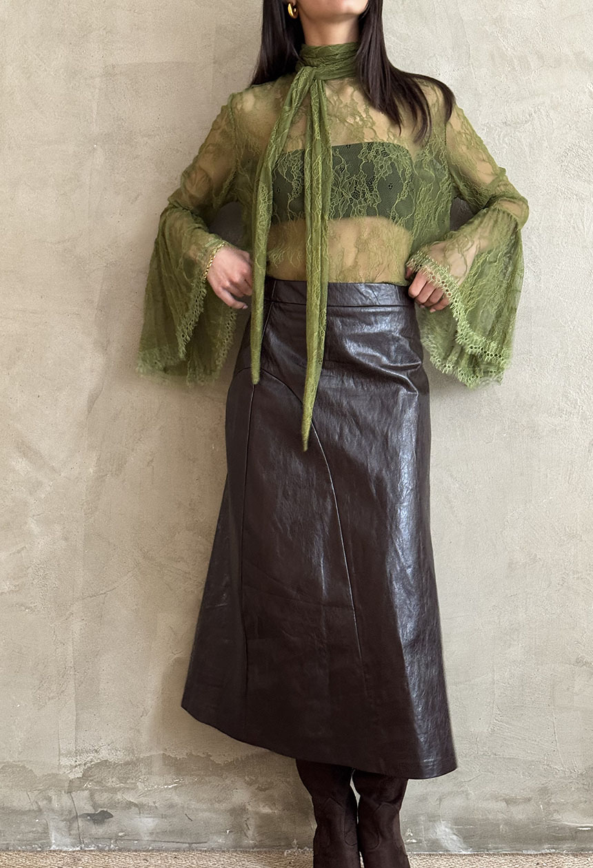 Φούστα μίντι από οικολογικό δέρμα,σε εβαζέ γραμμή,εσωτερική φόδρα, κλείνει με κρυφό πλαινό φερμουάρ.