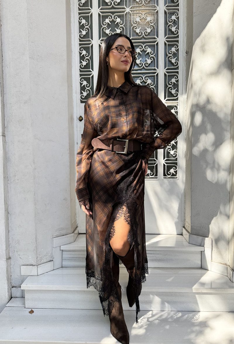 Φούστα ημιδιάφανη με εσωτερική φόδρα,καρό σχέδιο,ριχτή άνετη γραμμή,σκίσιμο στο μπροστινό μέρος, κρυφό λάστιχο στη μέση .