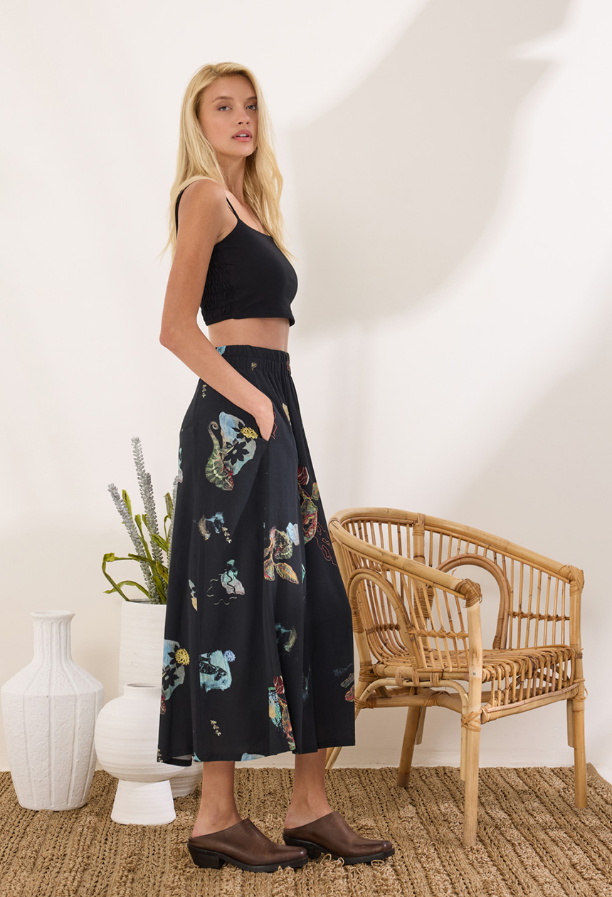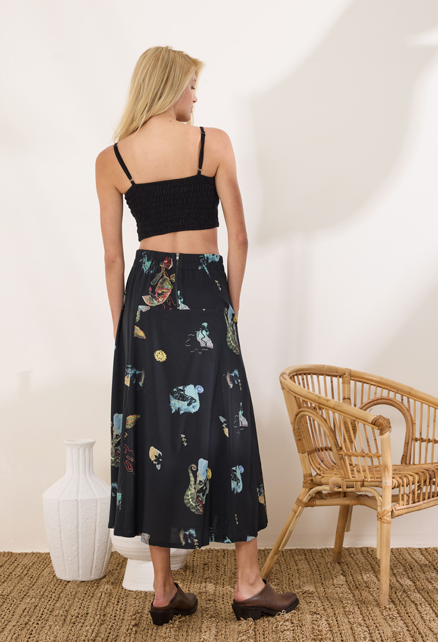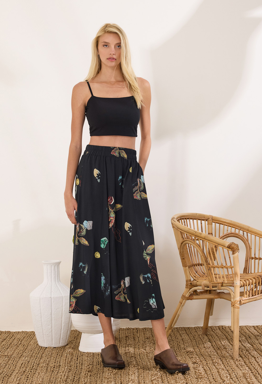 Midi φούστα σε εβαζέ γραμμή, με εντυπωσιακό print από 100% rayon. Λάστιχο στη μέση και φερμουάρ στο πίσω μέρος. Διαθέτει πλαϊνές τσέπες.