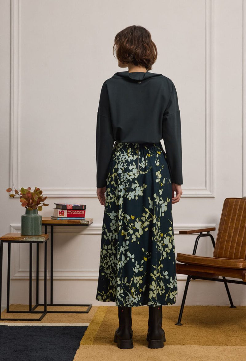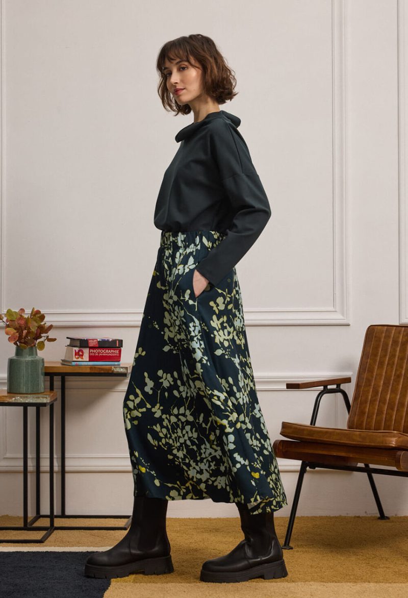 Midi φούστα σε εβαζέ γραμμή, με floral print σε αισθητική water color και ύφασμα από 100% viscoze Ecovero. Το λάστιχο στη μέση και το μεταλλικό φερμουάρ στο πίσω μέρος προσθέτει λεπτομέρεια και εξασφαλίζει άνετη εφαρμογή. Διαθέτει πλαϊνές τσέπες και αέρινη γραμμή που κολακεύει τη σιλουέτα. Φόρεσέ τη με το πουκάμισο SELKIE για ένα απόλυτα συντονισμένο και κομψό look.