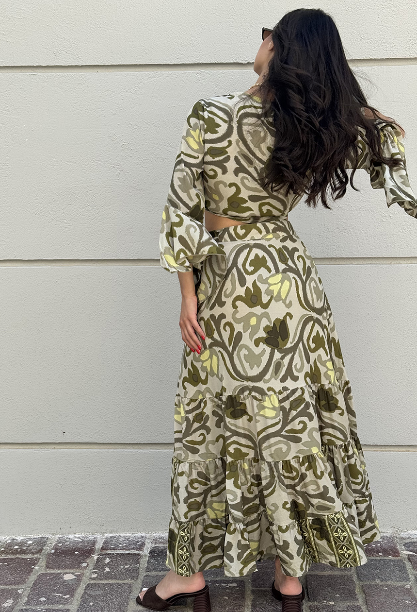 Silky touch ύφασμα με εμπριμέ σχέδιο σε olive απόχρωση.