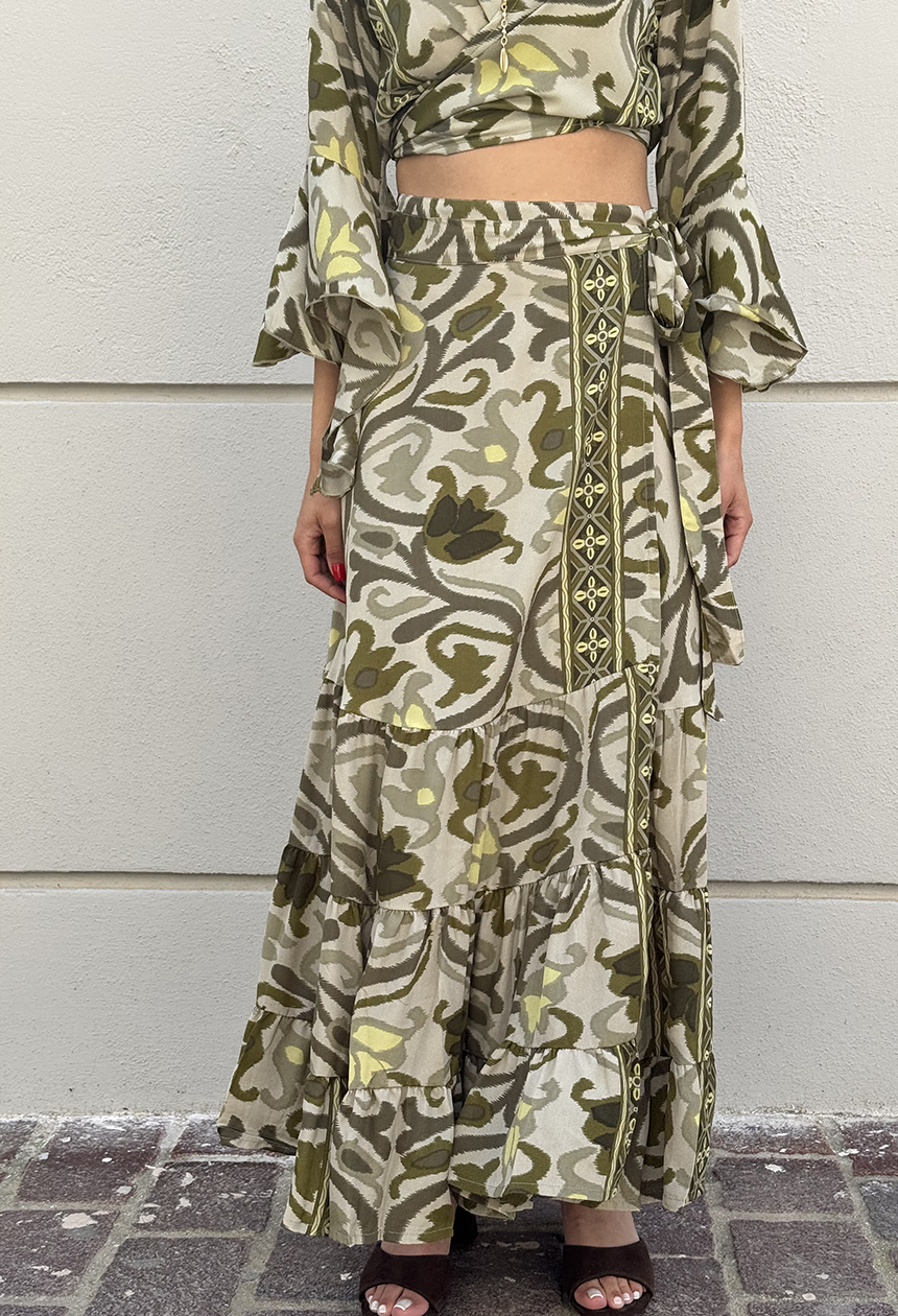Φούστα wrap,με μακρύ μήκος,δένει στη μέση,διακριτικό βολάν στο τελείωμα.