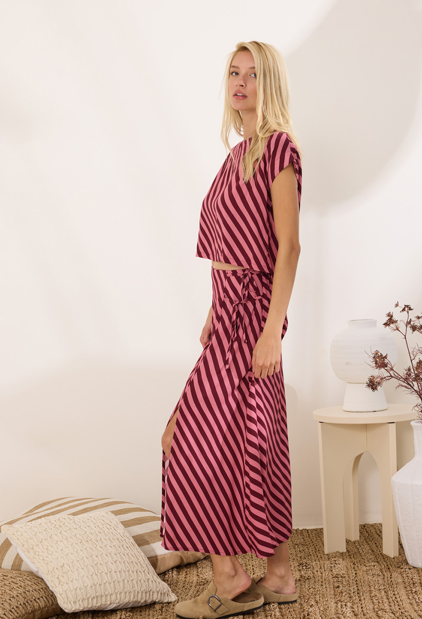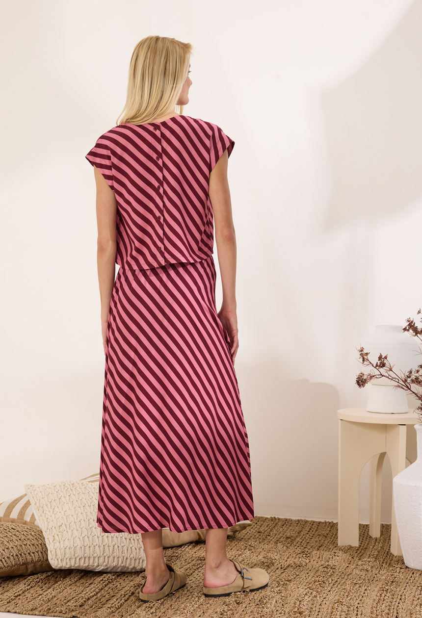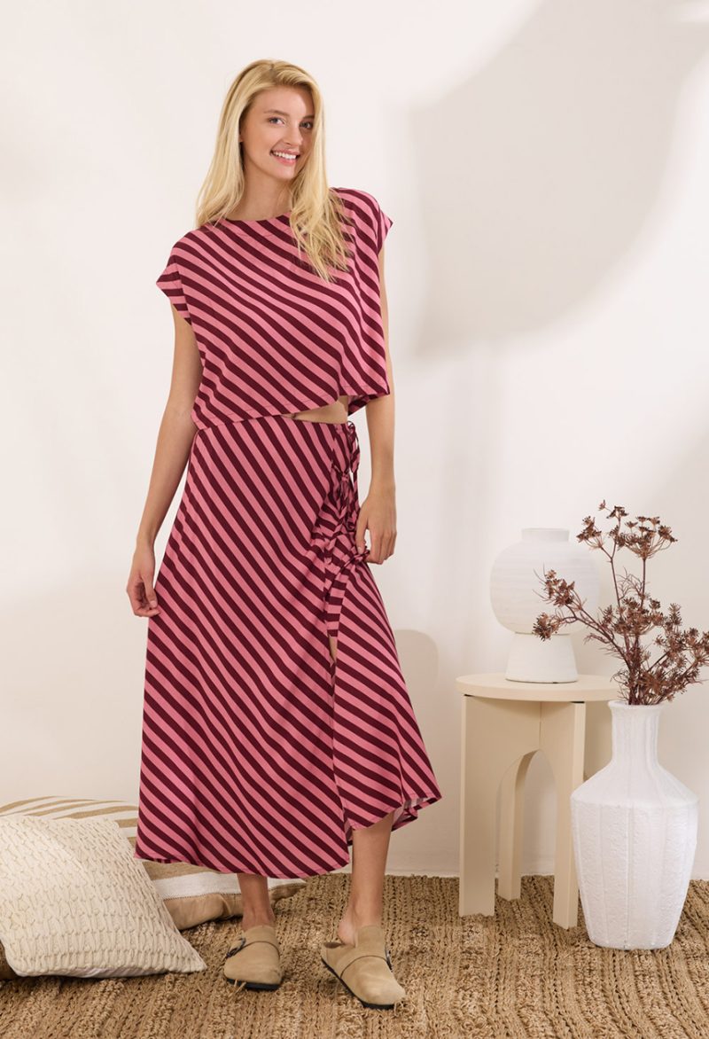 Φούστα σε Α γραμμή με άνοιγμα μπροστά, κατασκευασμένη από 100% rayon για απαλή αίσθηση. Διακοσμείται με έντονο print με ρίγες και διαθέτει διακοσμητικά κορδόνια στο πλάι. Λάστιχο πίσω στη μέση για τέλεια εφαρμογή και φερμουάρ στο πλάι για ευκολία. Συνδυάζεται αρμονικά με την τουνίκ Lumira, ολοκληρώνοντας ένα κομψό σετ.
