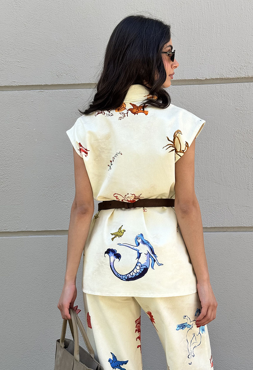 Γιλέκο με εμπριμέ σχέδιο,σε ριχτή άνετη γραμμή,γιακάς,κλείνει με κουμπιά.