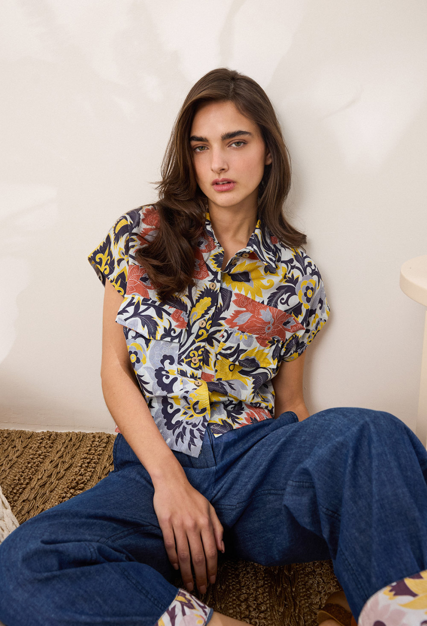 Πουκάμισο cropped με γιακά, από 100% βαμβάκι, που κλείνει μπροστά, προσφέροντας μοντέρνα γραμμή. Στο πίσω μέρος διαθέτει ωμίτη, ενώ το κάτω μέρος φέρει λάστιχο για άνετη εφαρμογή. Τα κοντά μανίκια ολοκληρώνουν τη χαλαρή αισθητική, ενώ οι μπροστινές τσέπες με καπάκι προσθέτουν διακριτική πρακτικότητα