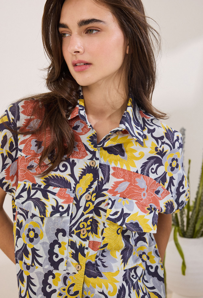 Πουκάμισο cropped με γιακά, από 100% βαμβάκι, που κλείνει μπροστά, προσφέροντας μοντέρνα γραμμή. Στο πίσω μέρος διαθέτει ωμίτη, ενώ το κάτω μέρος φέρει λάστιχο για άνετη εφαρμογή. Τα κοντά μανίκια ολοκληρώνουν τη χαλαρή αισθητική, ενώ οι μπροστινές τσέπες με καπάκι προσθέτουν διακριτική πρακτικότητα.