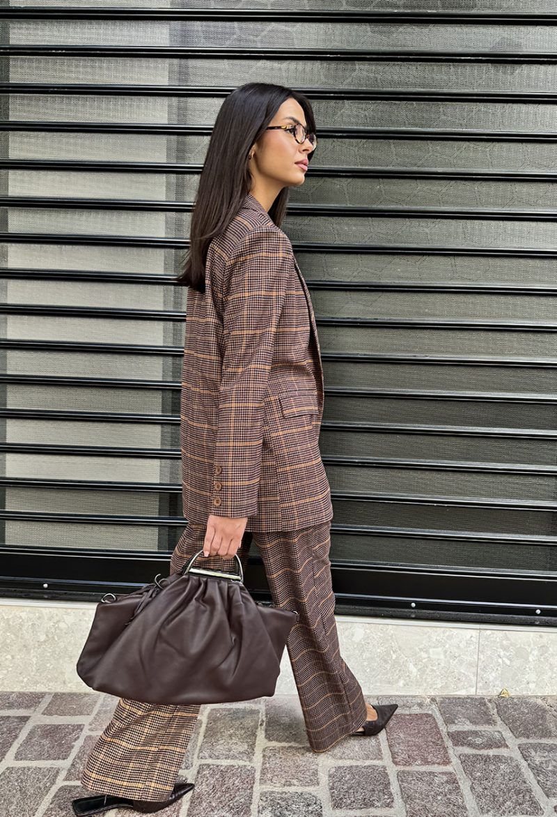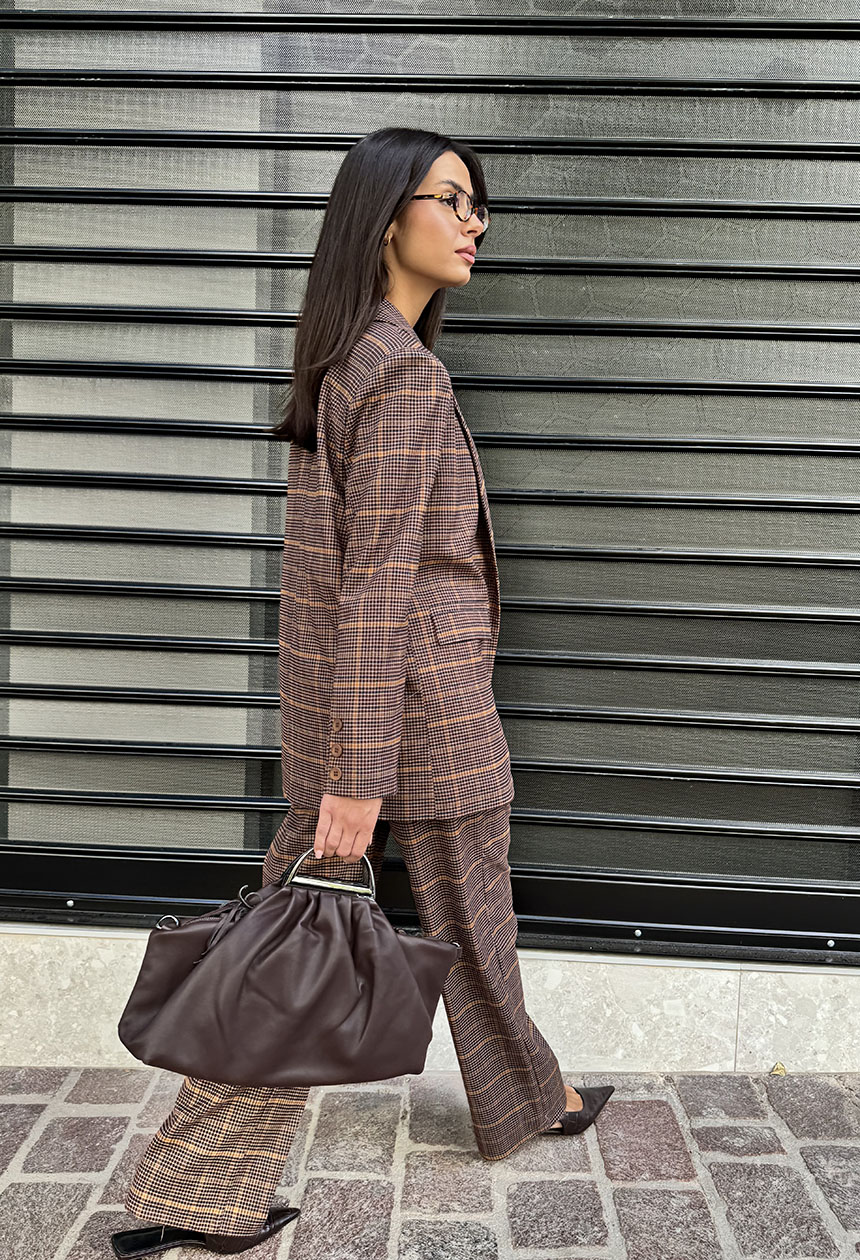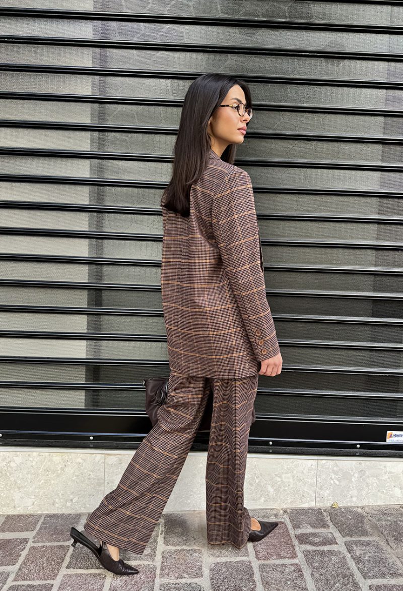 Σακάκι με καρό σχέδιο,σε κλασική ριχτή γραμμή, λεπτή βάτα,γιακάς πέτο, δύο τσέπες μπροστά,εσωτερική φόδρα,κλείνει με ένα κουμπί.