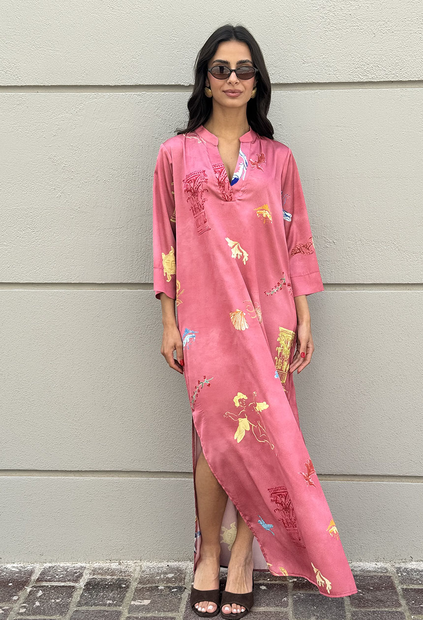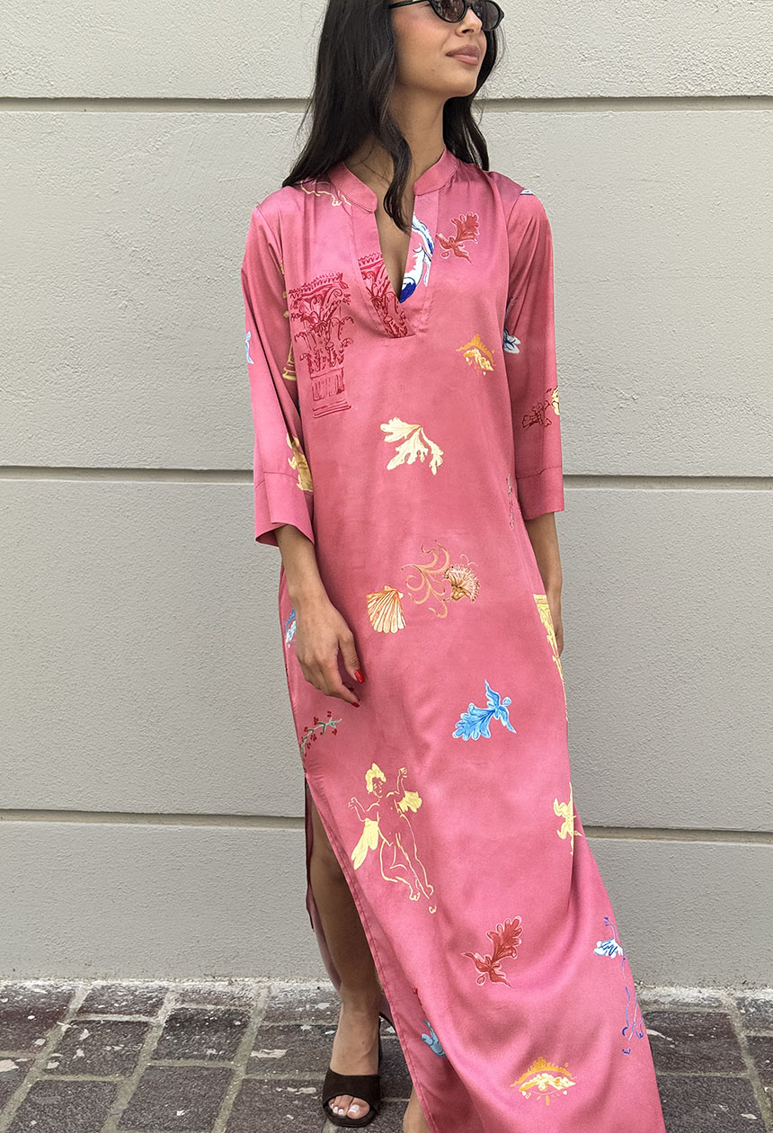 Καφτάνι με εμπριμέ σχέδιο,ροζ απόχρωση,μακρύ μήκος,σε ριχτή γραμμή,λαιμόκοψη με μικρό άνοιγμα V,μανίκια 3/4 και σκίσιμο στο πλάι.