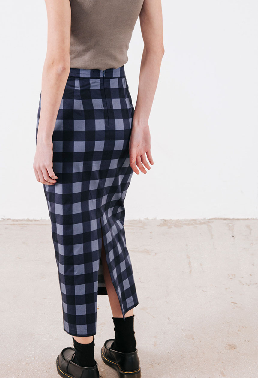 Καρό μίντι φούστα με άνοιγμα πίσω και κλείσιμο πίσω με κρυφό φερμουάρ.