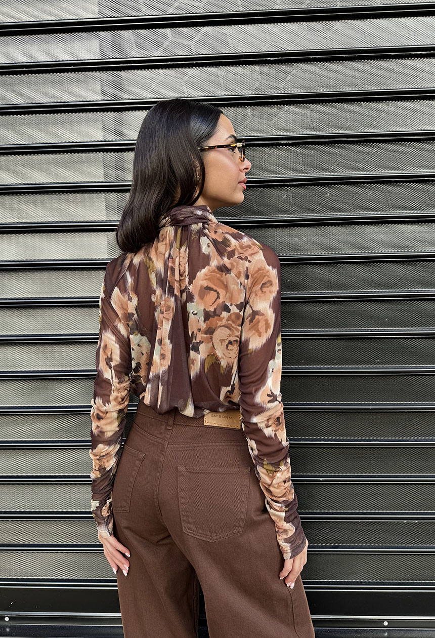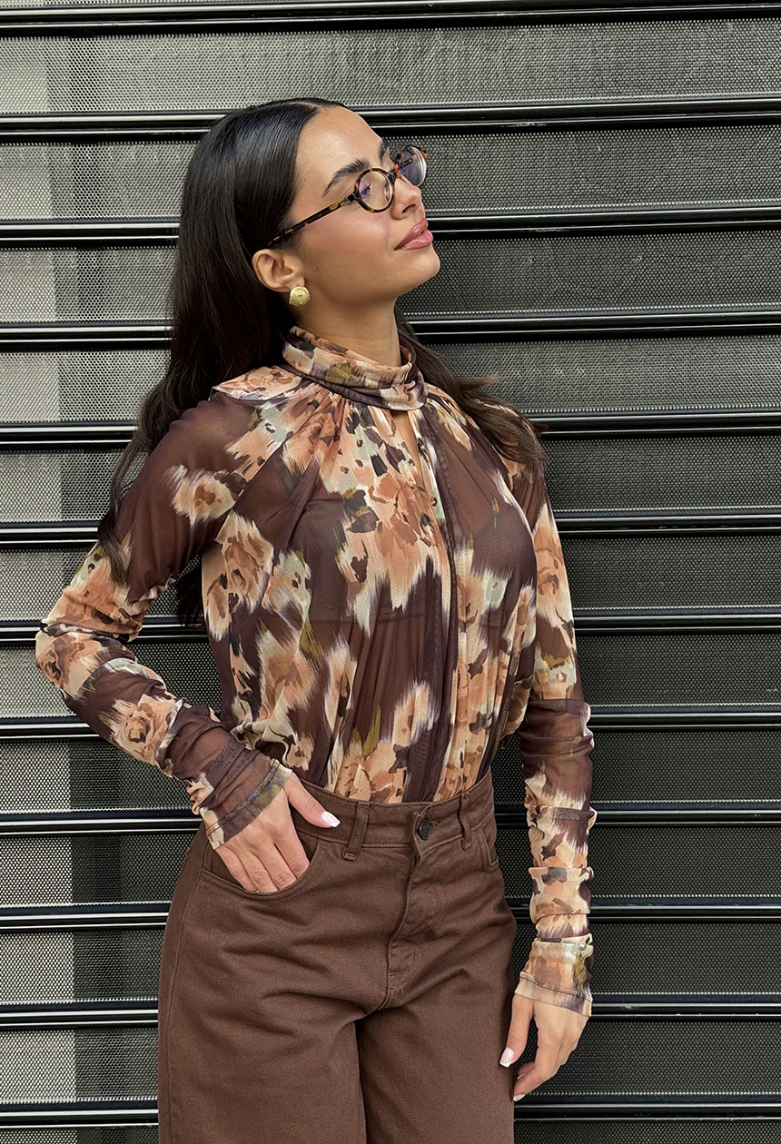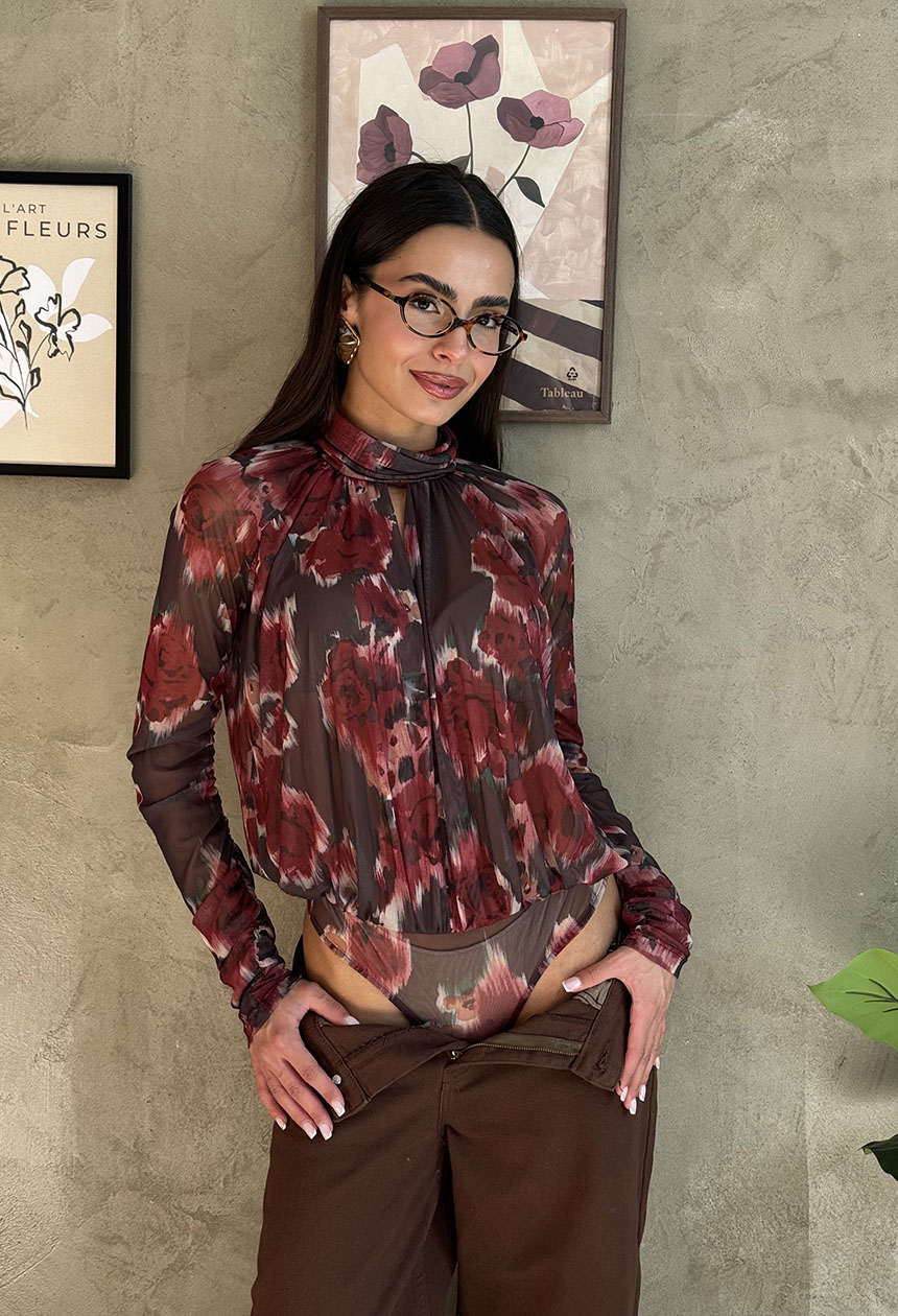 Κορμάκι φτιαγμένο από τούλι. Φλοράλ σχέδιο. Λεπτομέρεια ανοίγματος στο ντεκολτέ. Μανίκια με σούρες. Κανονική εφαρμογή, διαθέσιμο σε μεγέθη S/M και M/L.