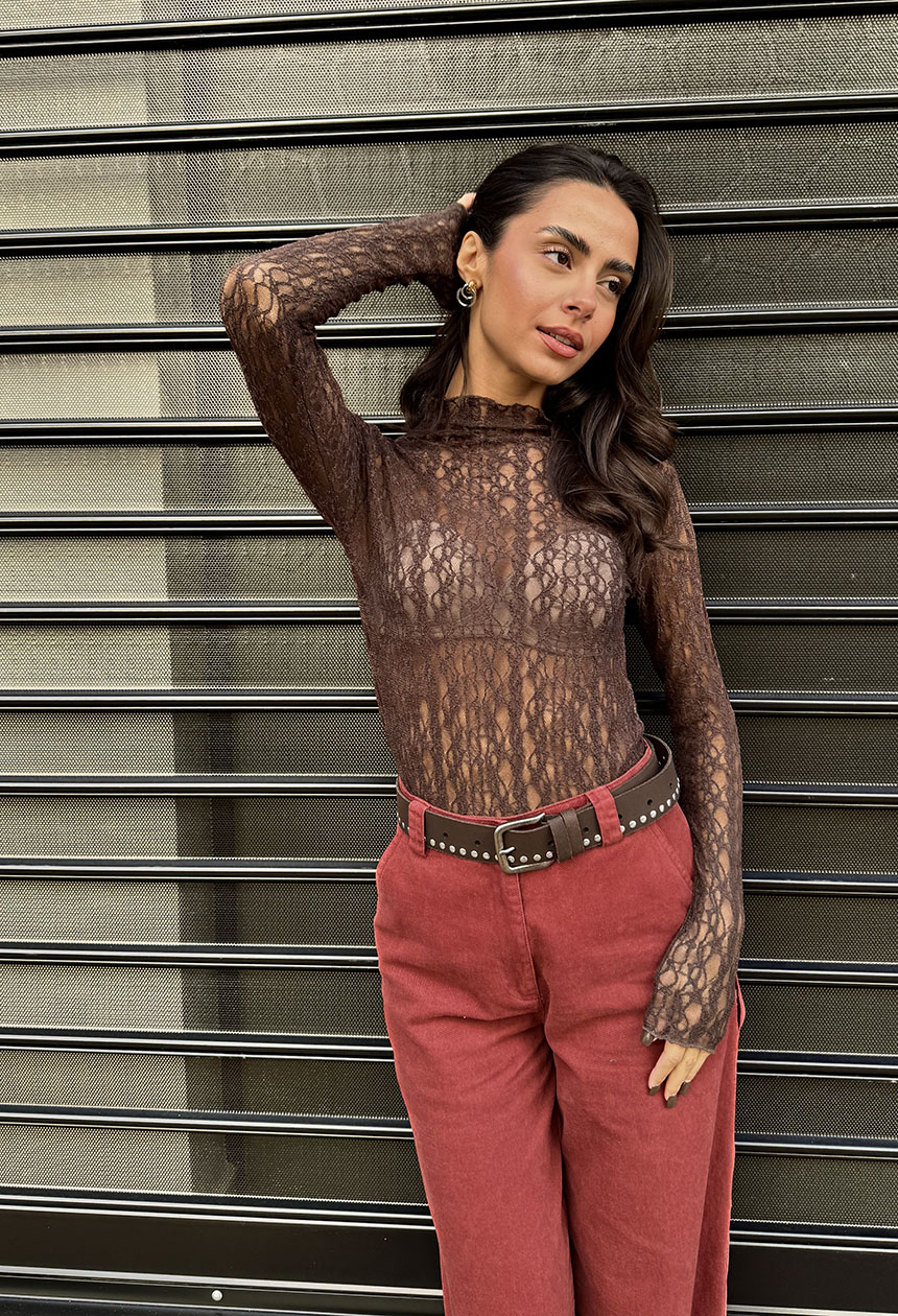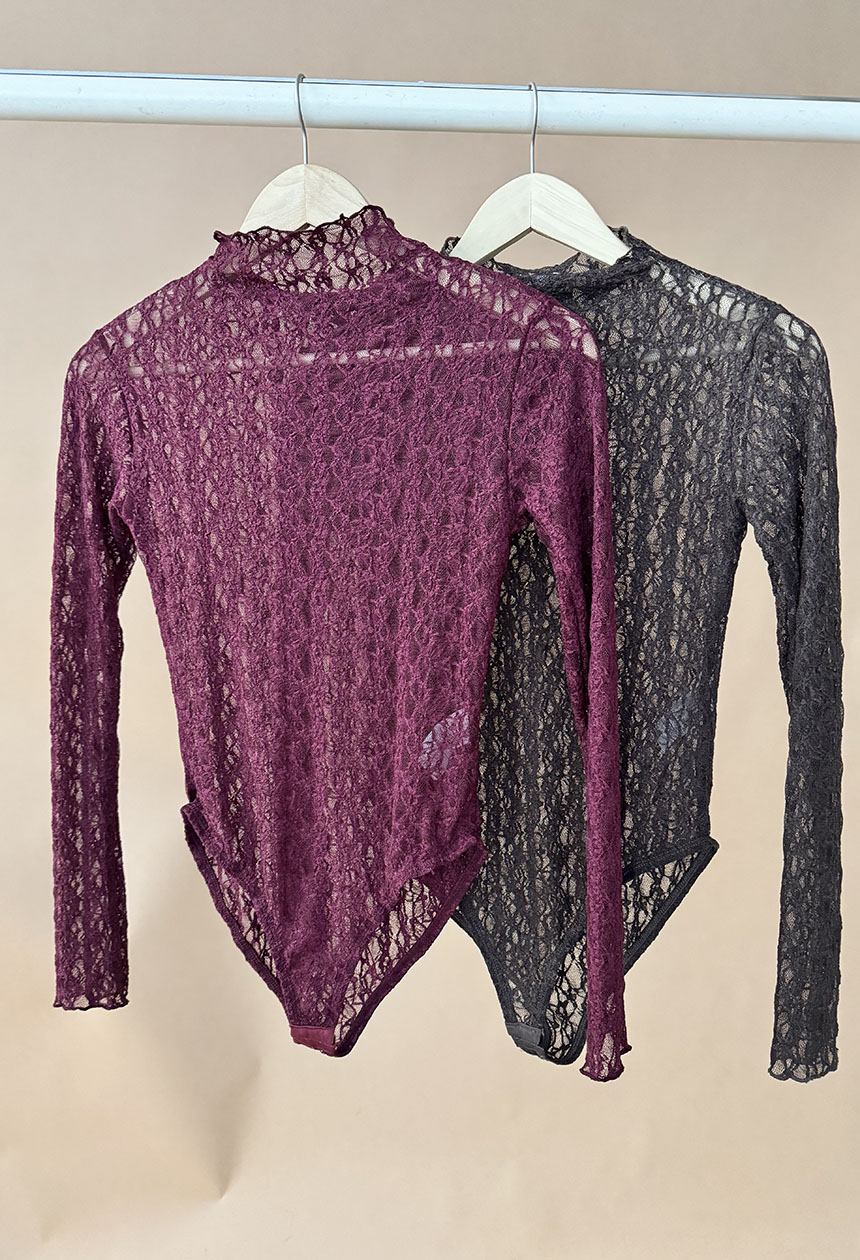 Κορμάκι ημιδιάφανο δαντέλα, με όρθιο λαιμό, κανονική εφαρμογή.