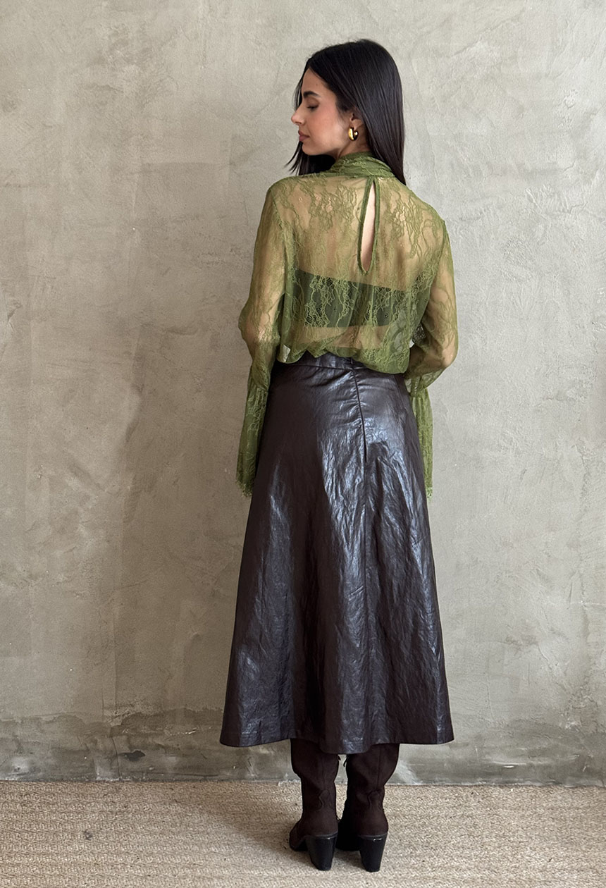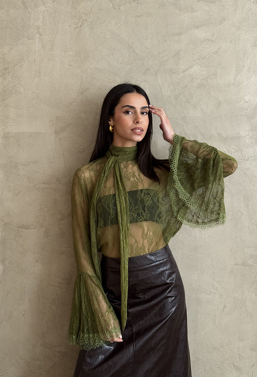 Μπλούζα ημιδιάφανη,με δαντελένιο σχέδιο,δένει αισθητικά στο λαιμό,μικρό σκίσιμο στη πλάτη,ιδιαίτερο μανίκι καμπάνα.