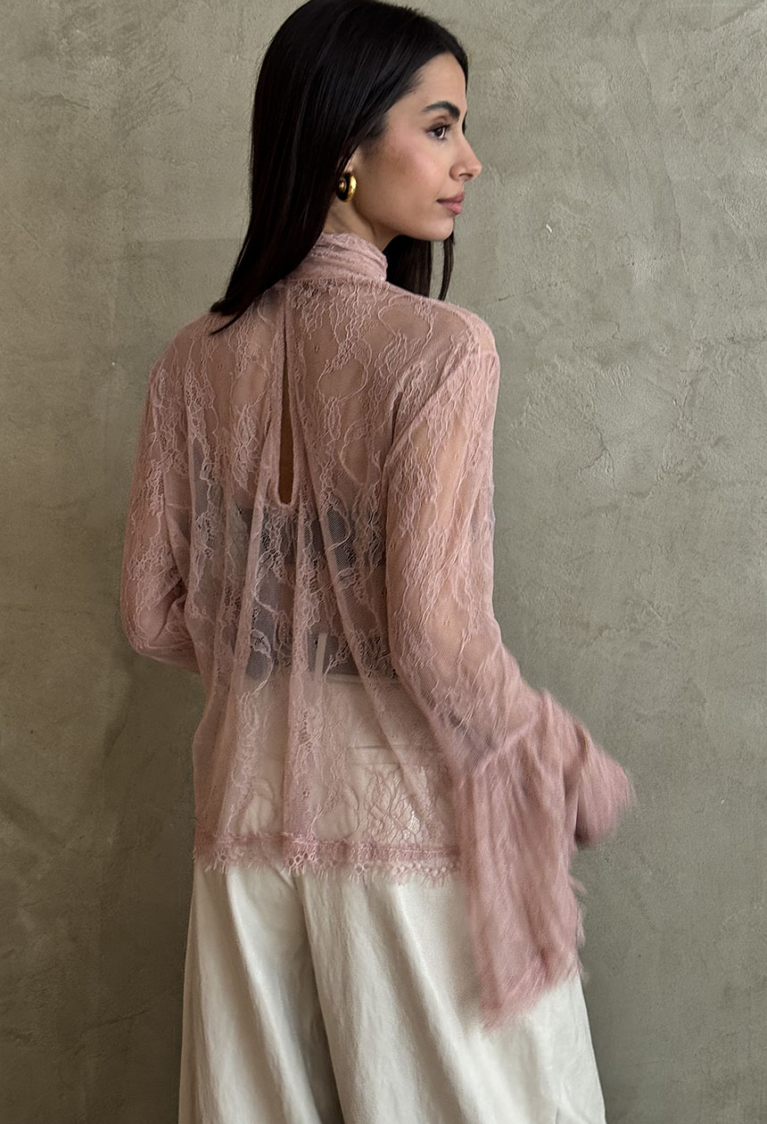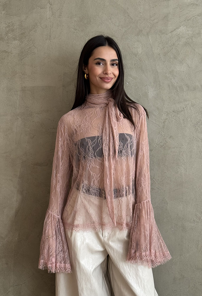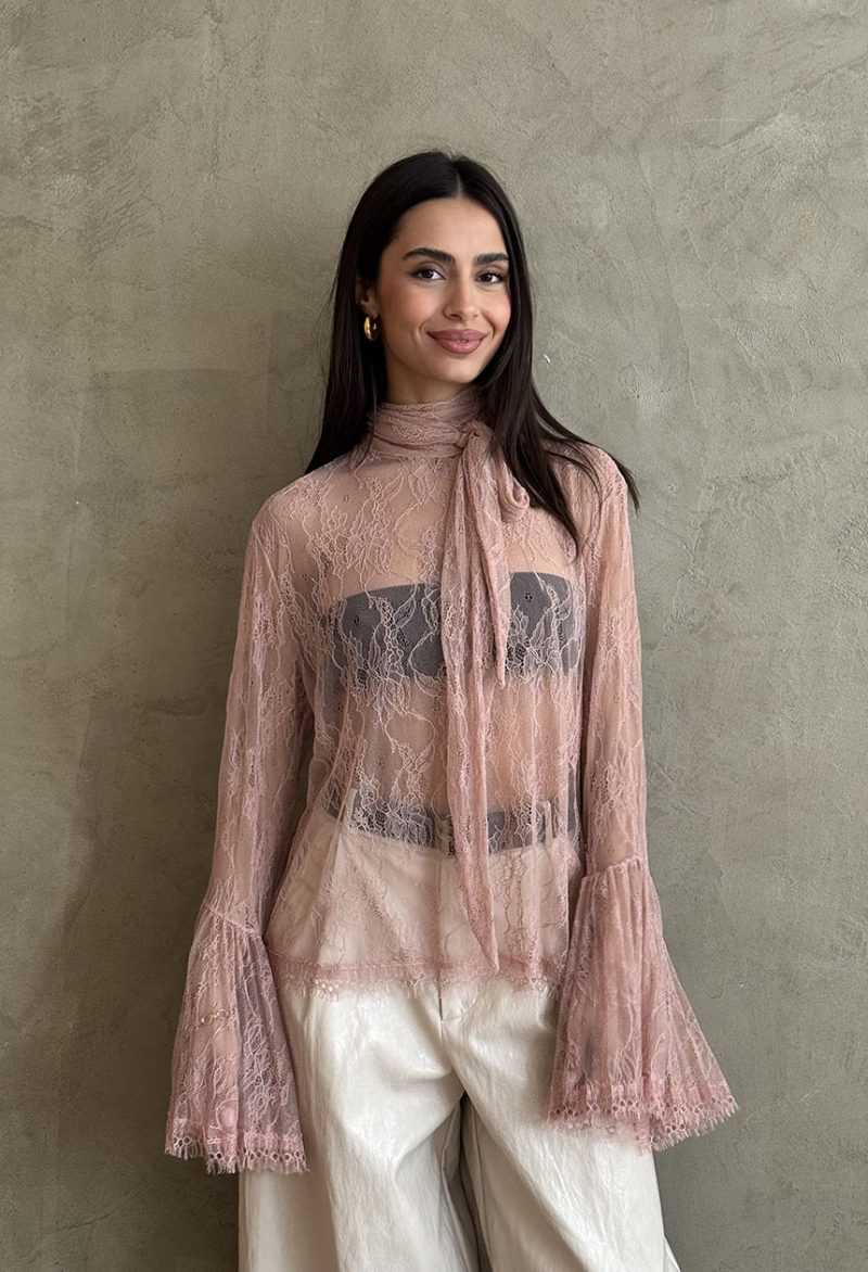 Μπλούζα ημιδιάφανη,με δαντελένιο σχέδιο,δένει αισθητικά στο λαιμό,μικρό σκίσιμο στη πλάτη,ιδιαίτερο μανίκι καμπάνα.