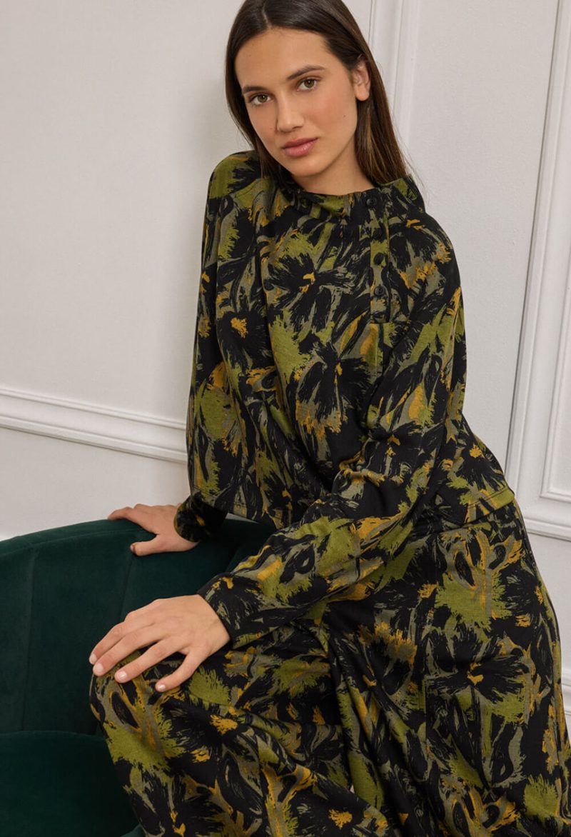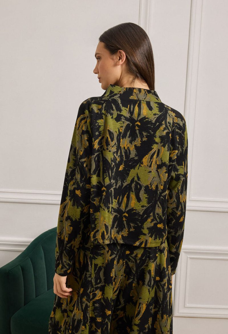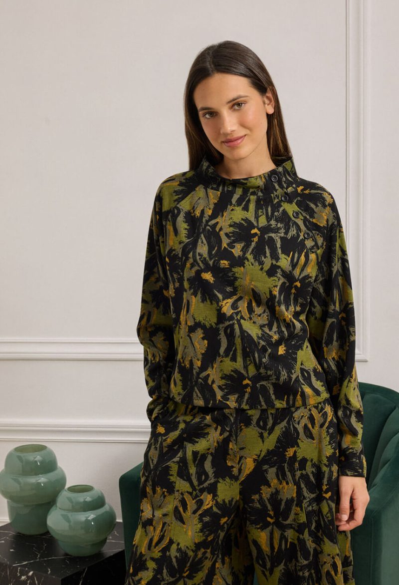 Μακρυμάνικη μπλούζα με abstract floral print, που συνδυάζει κομψότητα και χαρακτήρα με ένα μοντέρνο twist. Το χαλαρό ζιβάγκο προσφέρει άνεση και στυλ, ενώ το κλείσιμο στο πλάι με κουμπιά προσθέτει ιδιαίτερη σχεδιαστική λεπτομέρεια, που αναβαθμίζει το συνολικό look. Είναι το ιδανικό κομμάτι για να δώσεις ένταση σε μια καθημερινή εμφάνιση, χωρίς να χάνεις την αίσθηση της χαλαρότητας. Συνδυάζεται εξαιρετικά με το παντελόνι ZORO, δημιουργώντας ένα εκφραστικό και στυλάτο σύνολο, ιδανικό για όλες τις ώρες της ημέρας.