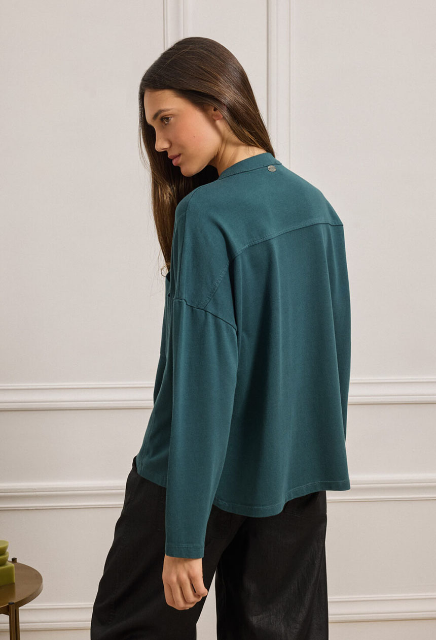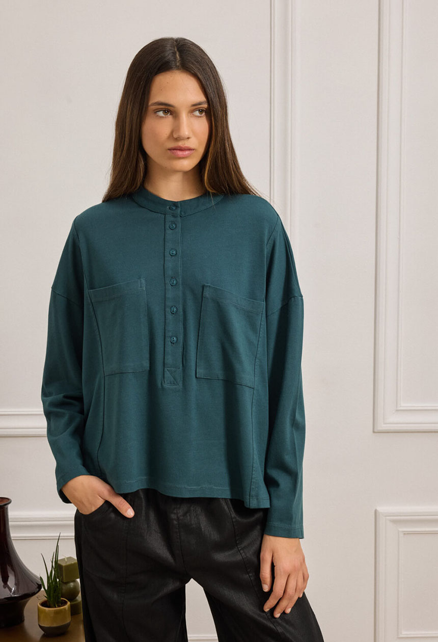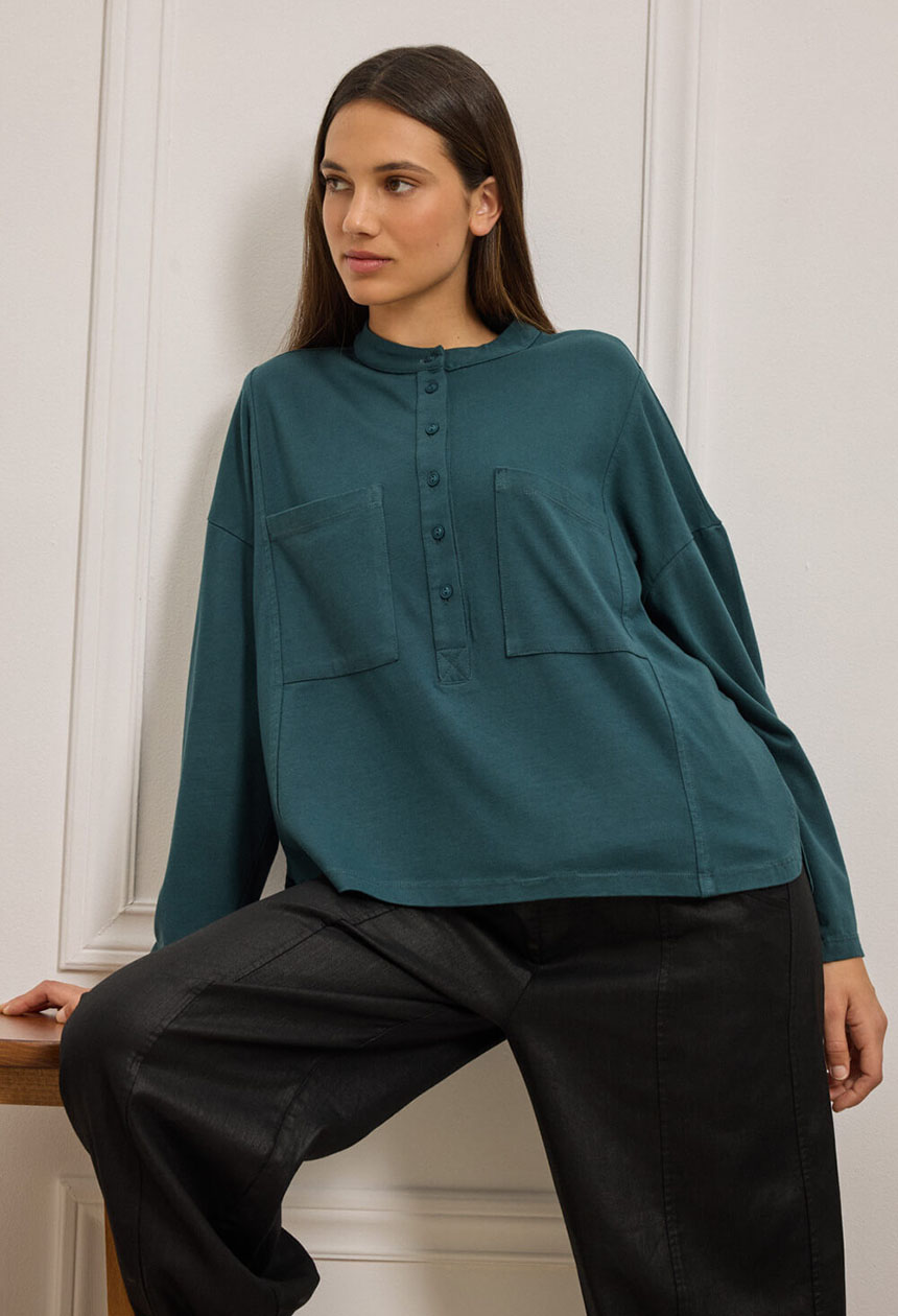 Μπλούζα σε ασύμμετρη γραμμή με τσέπες και μάο γιακά.