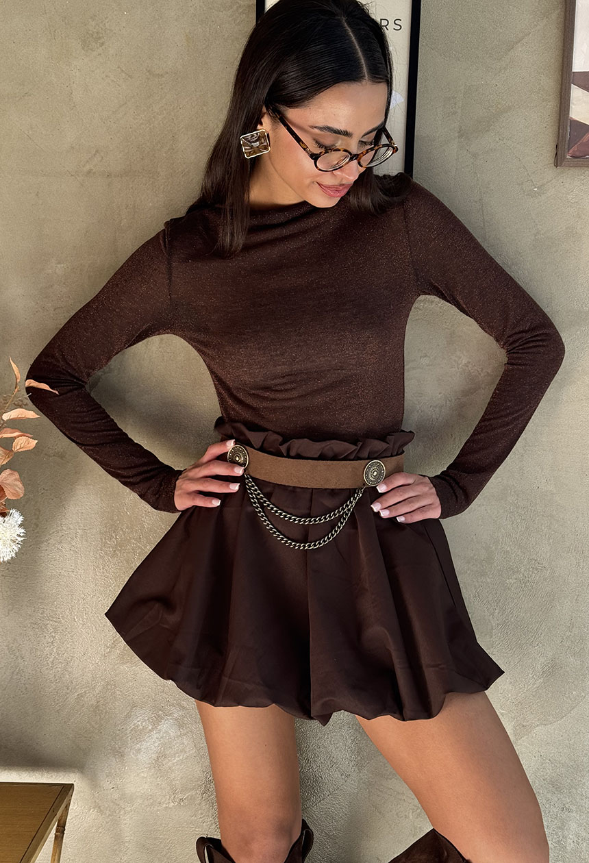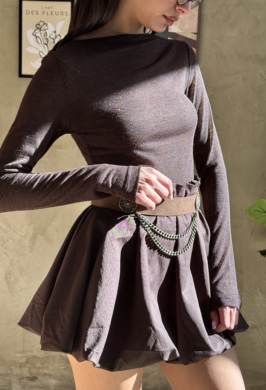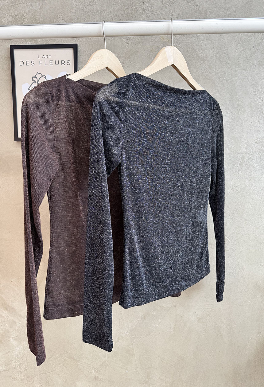 Τοπ από lurex. Λαιμόκοψη τύπου μπότο. Μακριά μανίκια. Κανονική εφαρμογή.