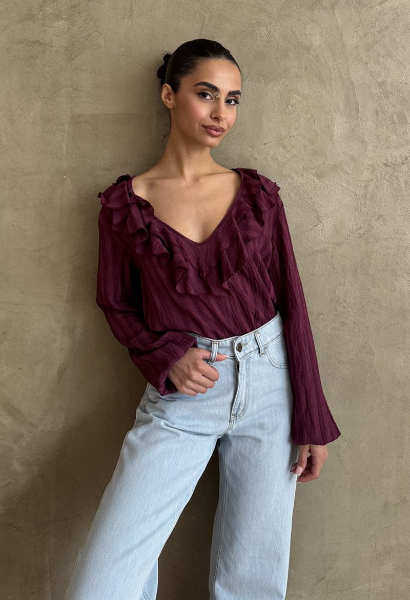 Μακρυμάνικη μπλούζα σε ριχτή γραμμή,λαιμόκοψη με βολάν στο V μπούστο που σχηματίζεται.