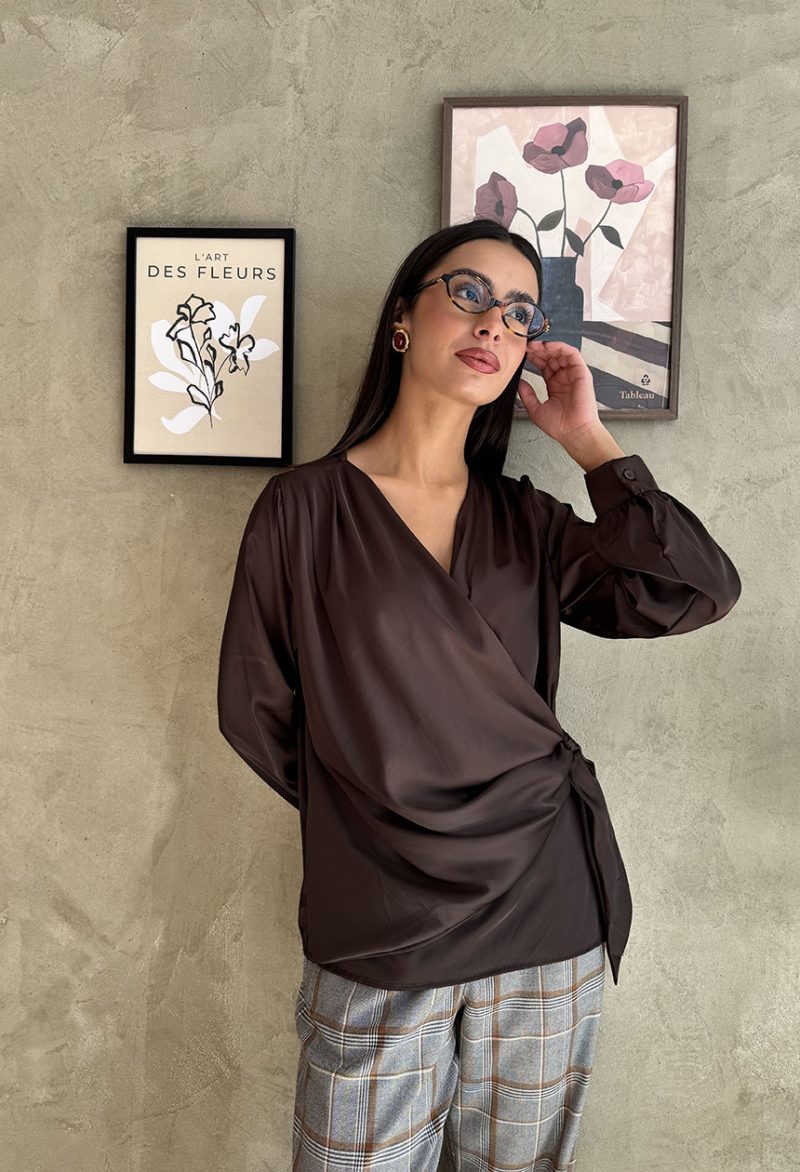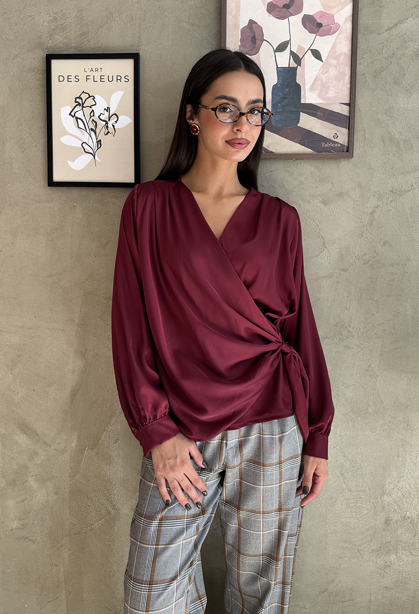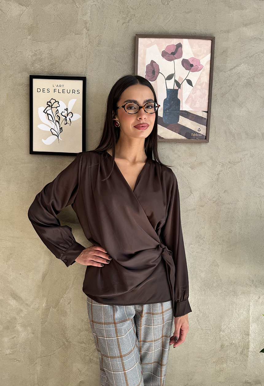 Μπλούζα κρουαζέ με μακρύ μανίκι, λαιμόκοψη με βαθύ V ντεκολτέ σε σατέν ύφασμα. Ο κόμπος δημιουργεί εντυπωσιακό παιχνίδι όγκων και κίνησης, προσδίδοντας κομψότητα και μοντέρνα φινέτσα.Απόλυτα θηλυκή, αυτή η μπλούζα ξεχωρίζει με το χυτό σατέν ύφασμα που αγκαλιάζει με φυσικό τρόπο το σώμα.