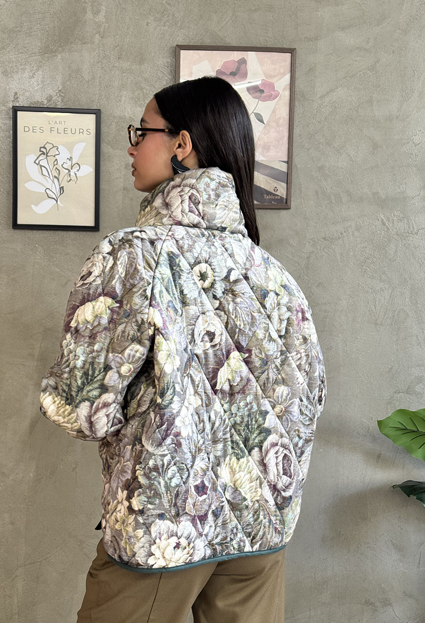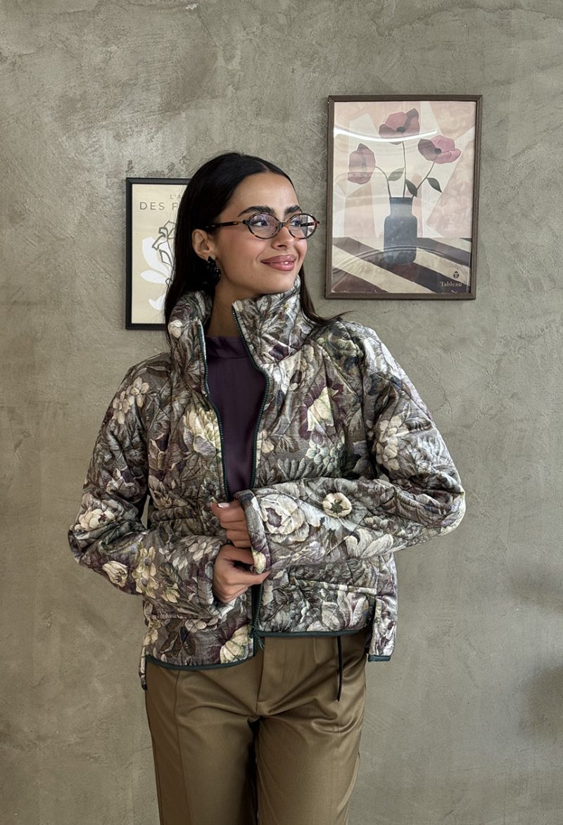 Μπουφάν cropped σε καπιτονέ υφή με διακριτικό βελούδινο φινίρισμα, και ήσυχο εμπριμέ print. Η boxy γραμμή του χαρίζει μοντέρνα δομή, ενώ ο ψηλός γιακάς ενισχύει τη γεωμετρία του σχεδίου. Είναι ασύμμετρο με διακριτικά ανοίγματα στα πλαϊνά. Κλείσιμο με φερμουάρ και πρακτικές τσέπες που ενσωματώνονται αρμονικά στο σύνολο.
