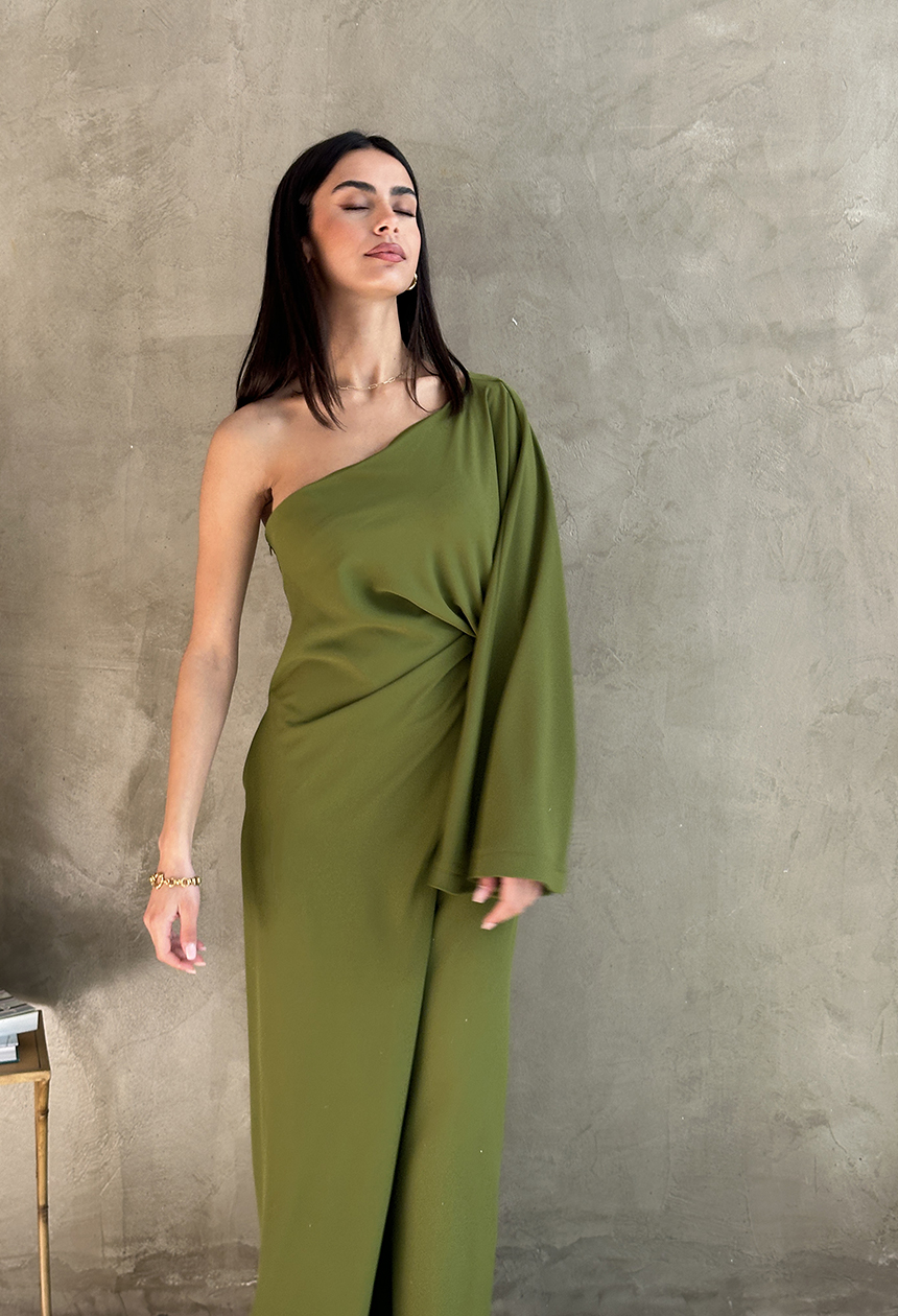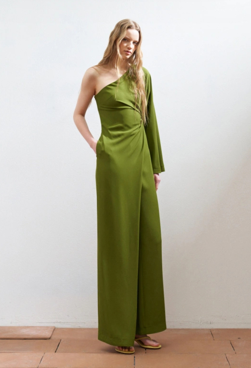 Ολόσωμη φόρμα με ένα ώμο,μακρύ μανίκι,ντραπέ λεπτομέρεια,ασύμμετρο σχέδιο,αγκαλιάζει τη σιλουέτα,ιδανική για ιδιαίτερες περιστάσεις.