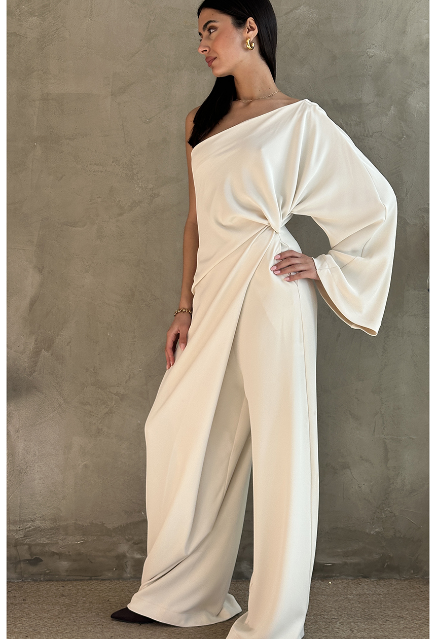 Ολόσωμη φόρμα με ένα ώμο,μακρύ μανίκι,ντραπέ λεπτομέρεια,ασύμμετρο σχέδιο,αγκαλιάζει τη σιλουέτα,ιδανική για ιδιαίτερες περιστάσεις.