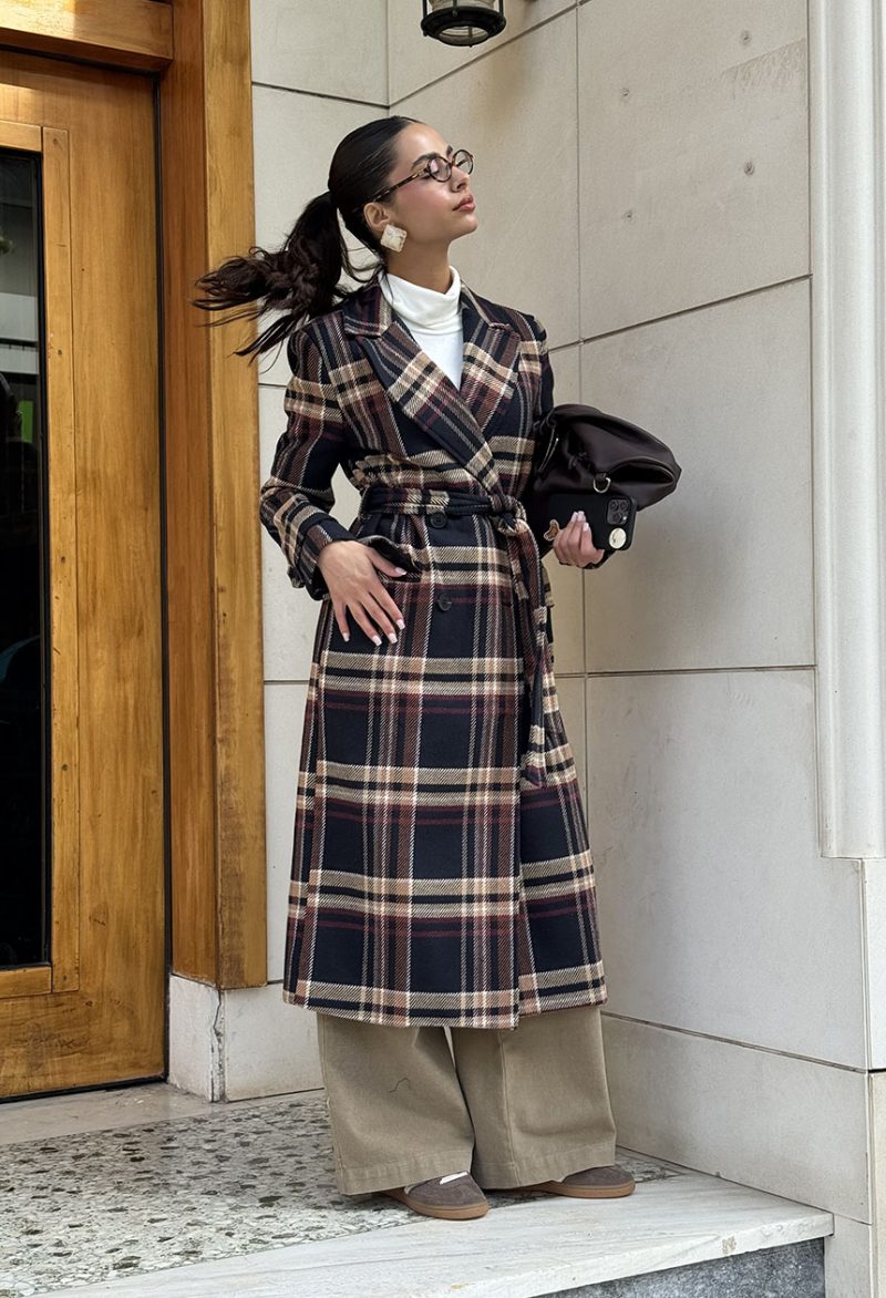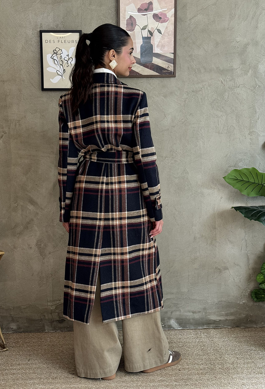 Καρό παλτό μακρύ με ζώνη στη μέση