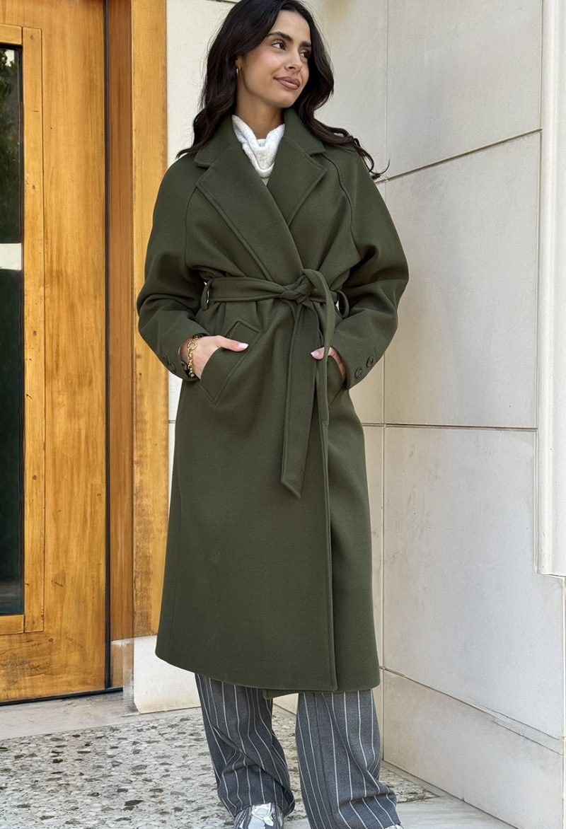Παλτό σε μακρύ μήκος,πέτο,γιακάς,δένει με δική του ζώνη στη μέση,εσωτερική φόδρα.