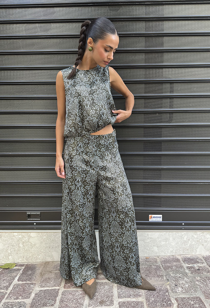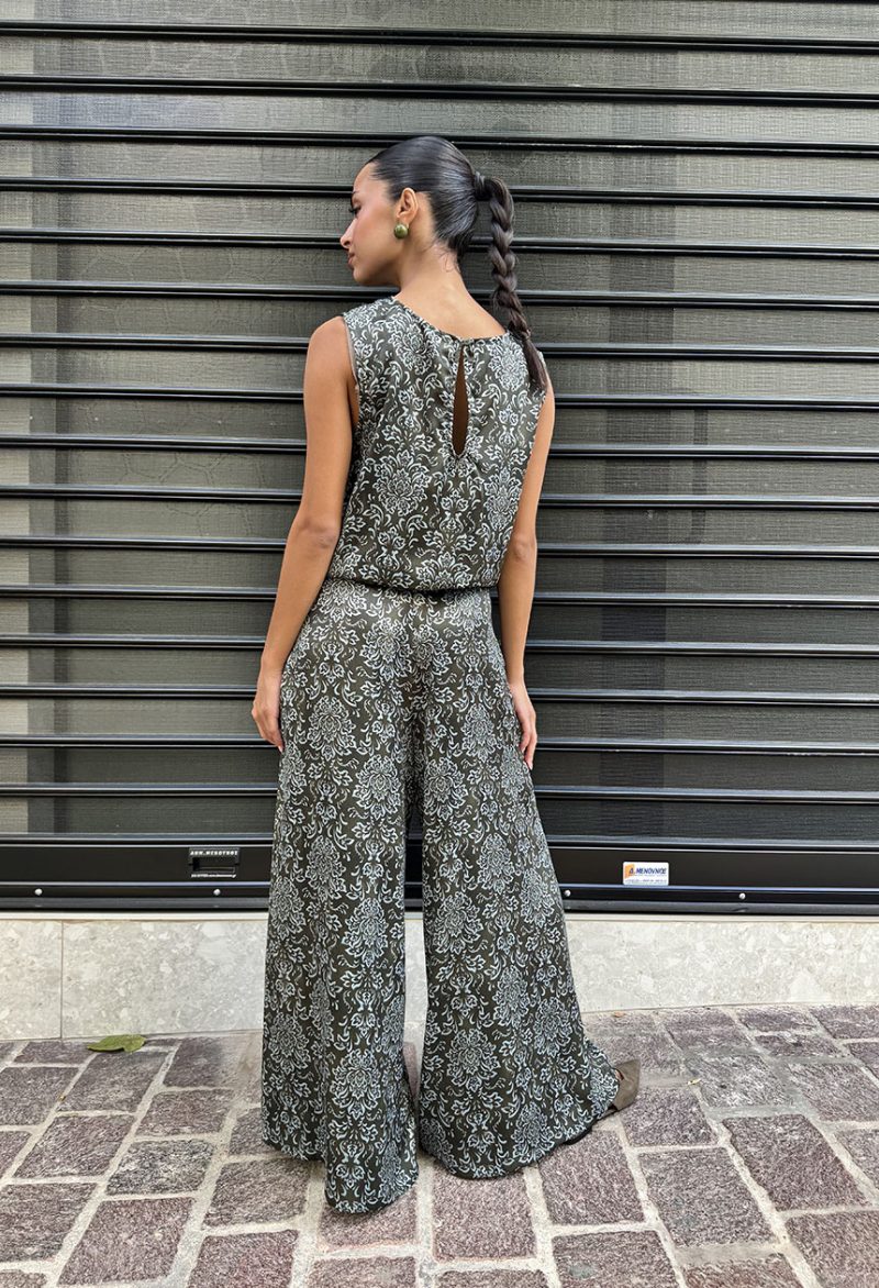 Παντελόνα με εμπριμέ σχέδιο,σε φαρδιά ριχτή γραμμή,κλείνει με κρυφό φερμουάρ στο πλάι.