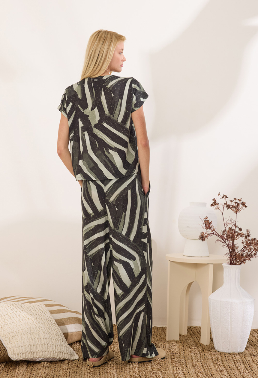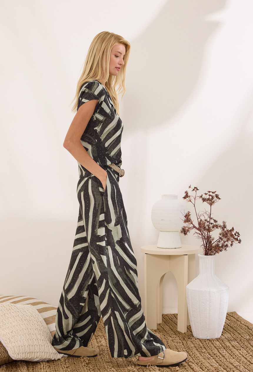 Παντελόνα από 100% viscose με χαλαρή γραμμή για άνετη εφαρμογή. Διαθέτει κλασικό κλείσιμο με κουμπί και φερμουάρ, πλαϊνές τσέπες και ελαφρώς διακριτικές πιέτες στο επάνω μέρος που προσθέτουν δομή στο σχέδιο. Συνδυάζεται με την τουνίκ HALE.