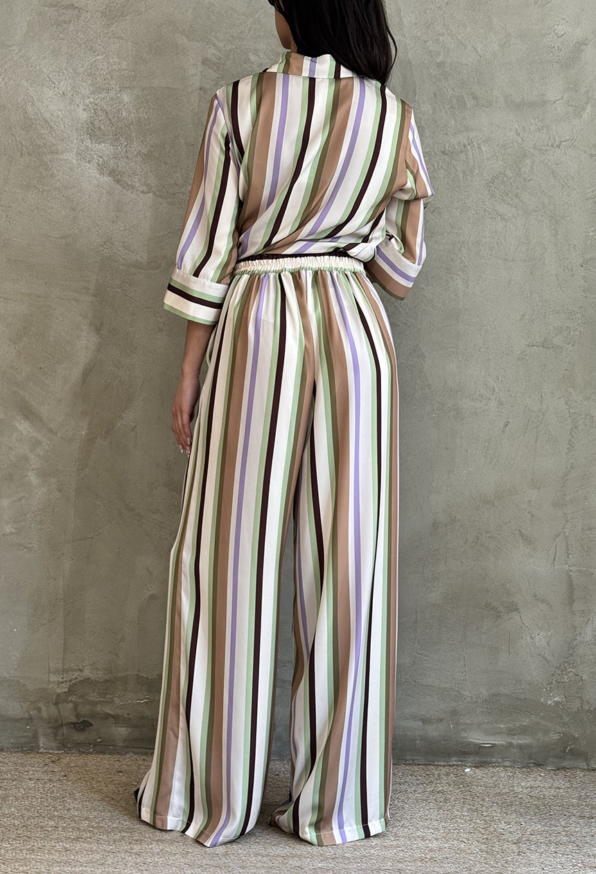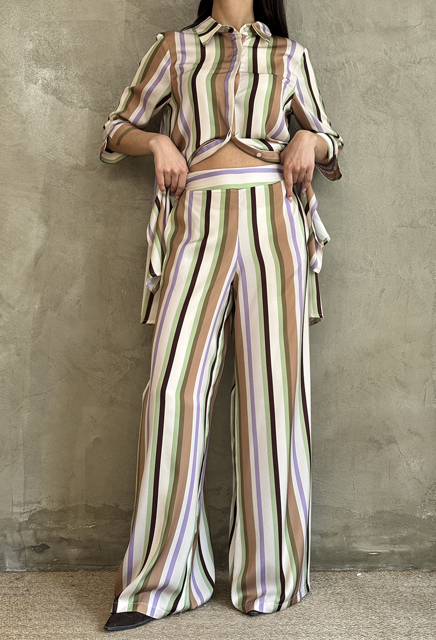 Παντελόνα με ριγέ σχέδιο σε άνετη ριχτή γραμμή, πλαϊνές κρυφές τσέπες, με λάστιχο πίσω στη μέση για τέλεια εφαρμογή.
