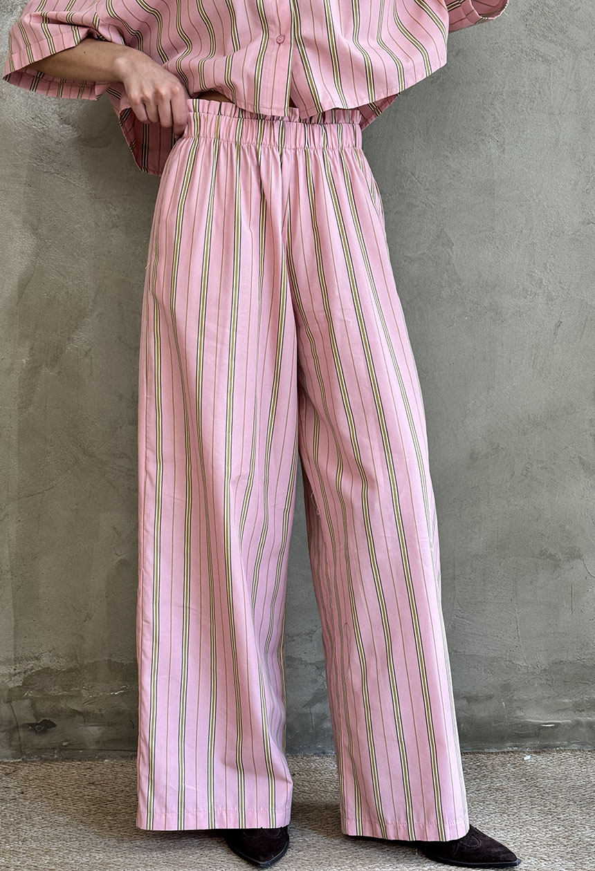Ριγέ παντελόνα φαρδιά με λάστιχο στη μέση και πλαϊνές τσέπες.