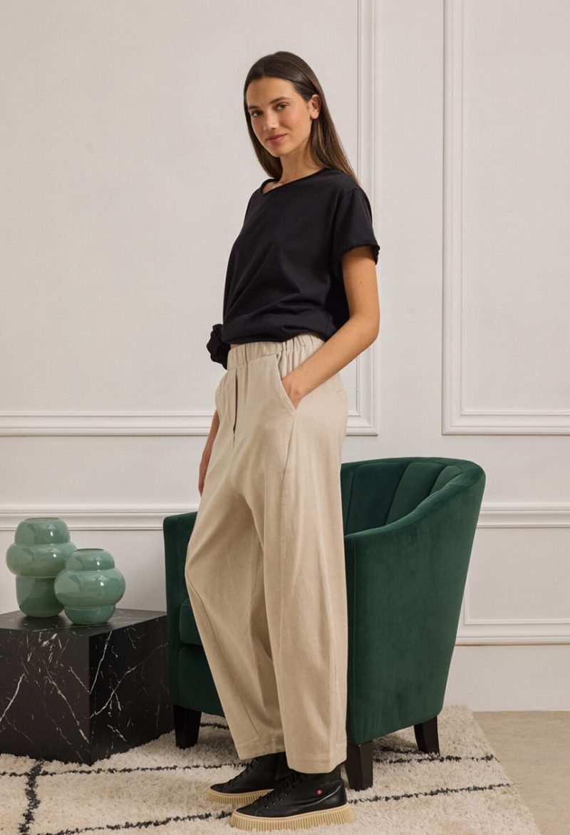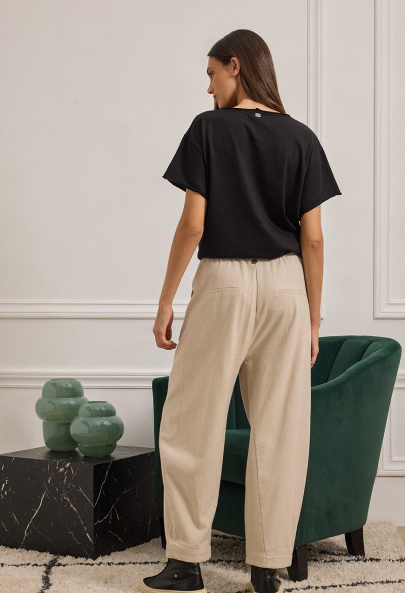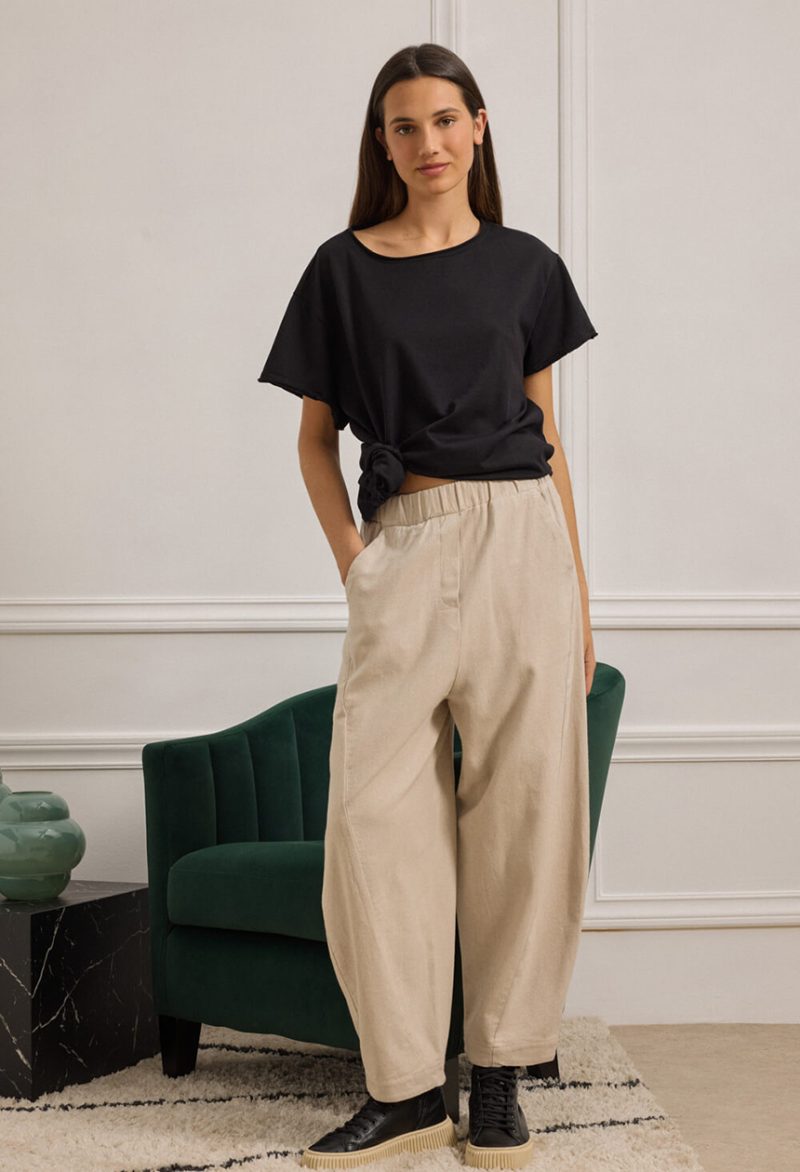 Παντελόνι από 100% βαμβάκι, με εξαιρετικά απαλή υφή και άνετη γραμμή που στενεύει διακριτικά προς τα κάτω σε tapered σχήμα. Διαθέτει πρακτικές τσέπες στα πλάγια, ενώ το λάστιχο στη μέση εξασφαλίζει άψογη εφαρμογή και απόλυτη ευκολία στην κίνηση. Οι σχεδιαστικές ραφές χαρίζουν χαρακτήρα και δομή, αναδεικνύοντας τη λιτή, καθημερινή του κομψότητα.