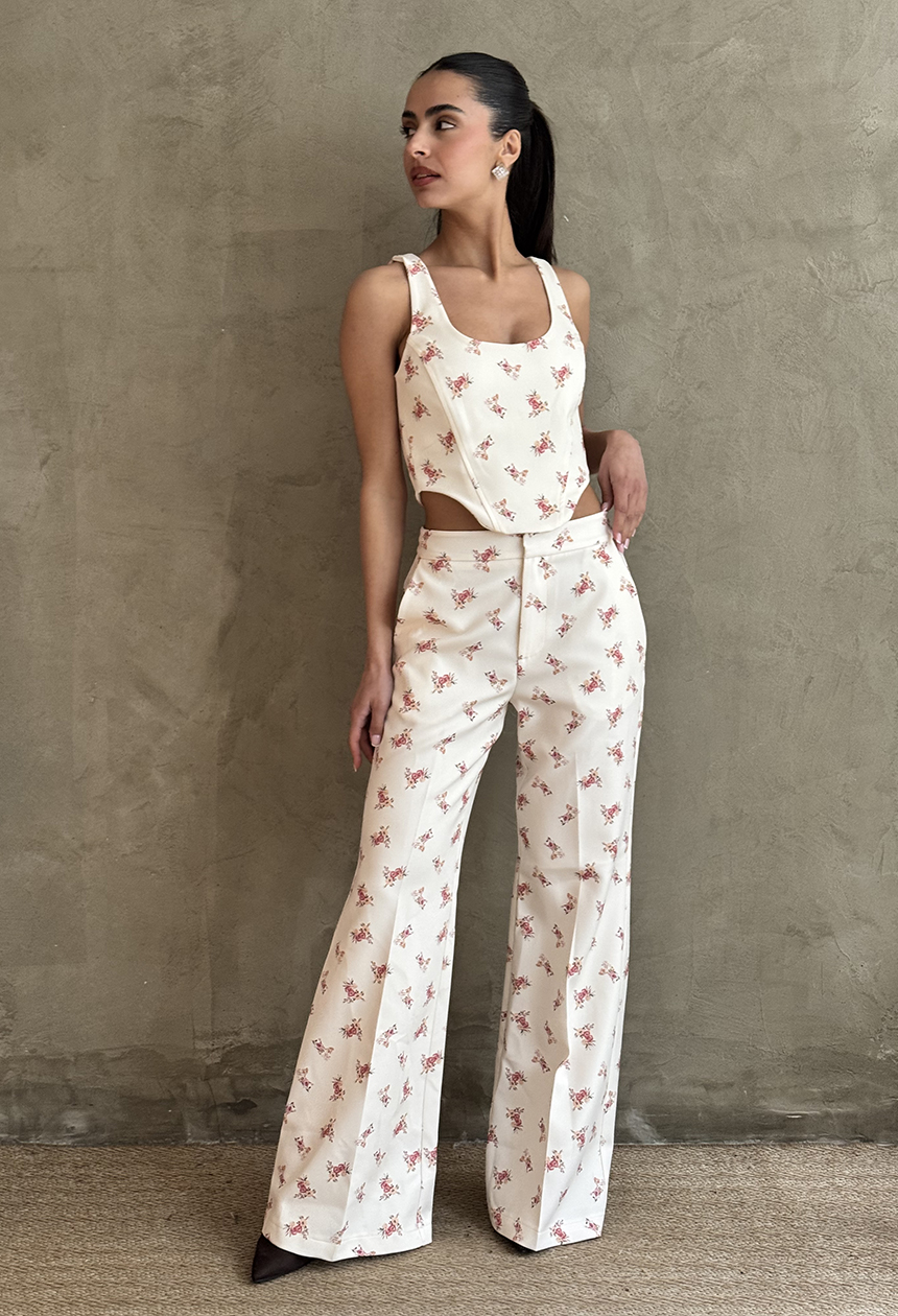 Παντελόνι ψηλόμεσο,με φλοράλ σχέδιο,πλαινές τσέπες,φαρδύ μπατζάκι,κανονική εφαρμογή,κλείνει με φερμουάρ και γατζάκι.