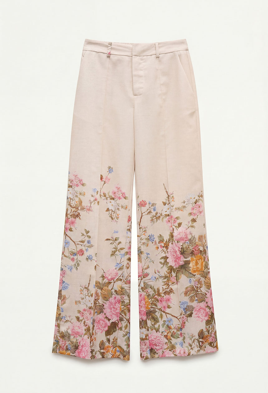 Παντελόνι ψηλόμεσο με ιδιαίτερο floral σχέδιο,κανονική εφαρμογή,φαρδύ μπατζάκι,πλαινές τσέπες,λάστιχο πίσω στη μέση,κλείνει με γάτζο και φερμουάρ.