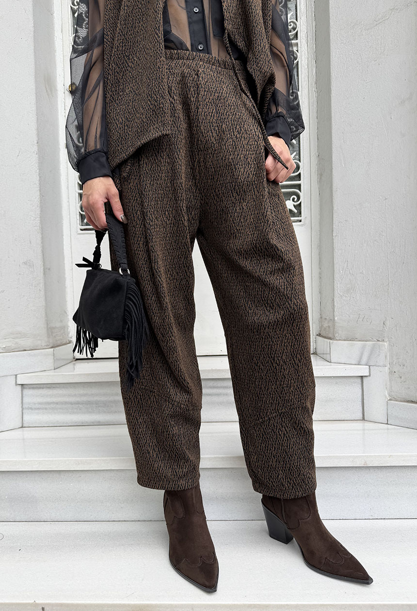 Παντελόνι σε joker γραμμή με λάστιχο στη μέση, μια πιέτα μπροστλα και πλαϊνές τσέπες. Συνδυάζεται και δημιουργελι σετ με το γιλέκο Achara.