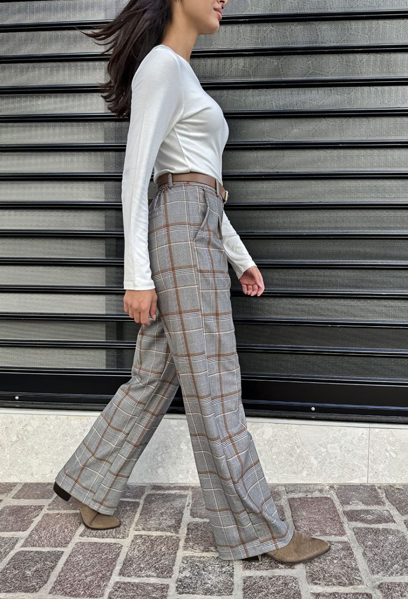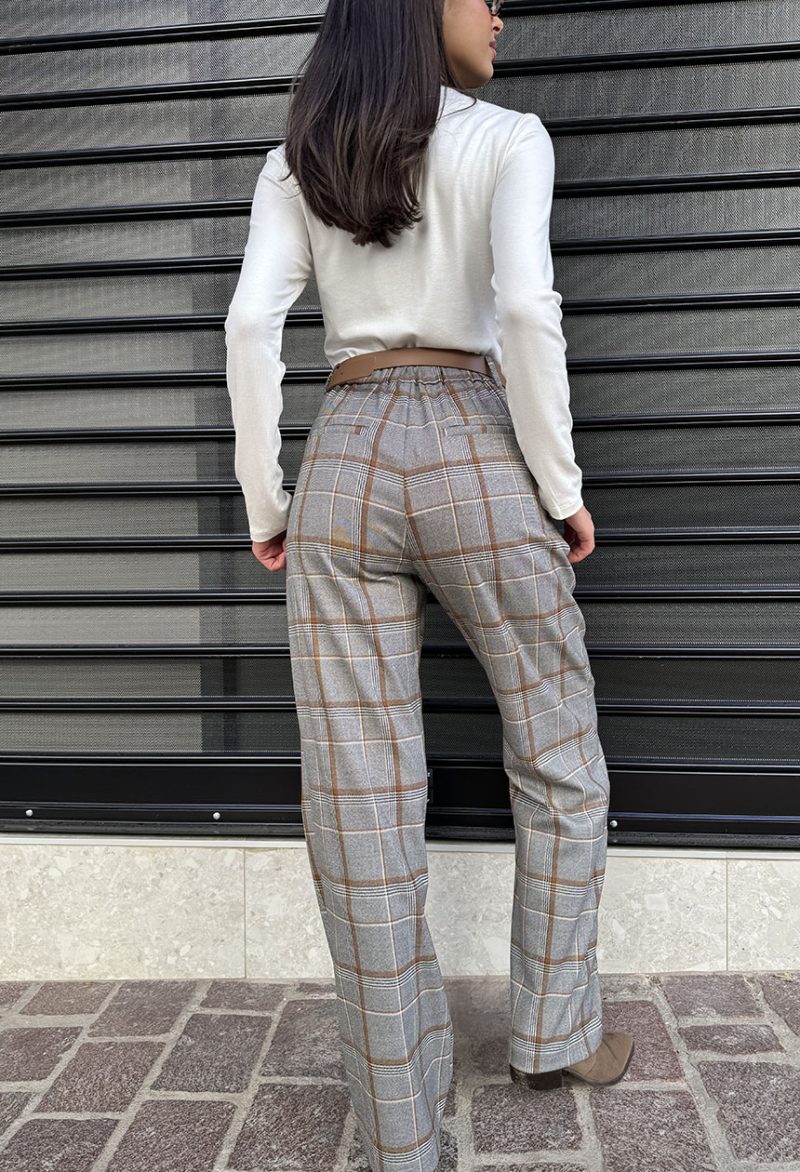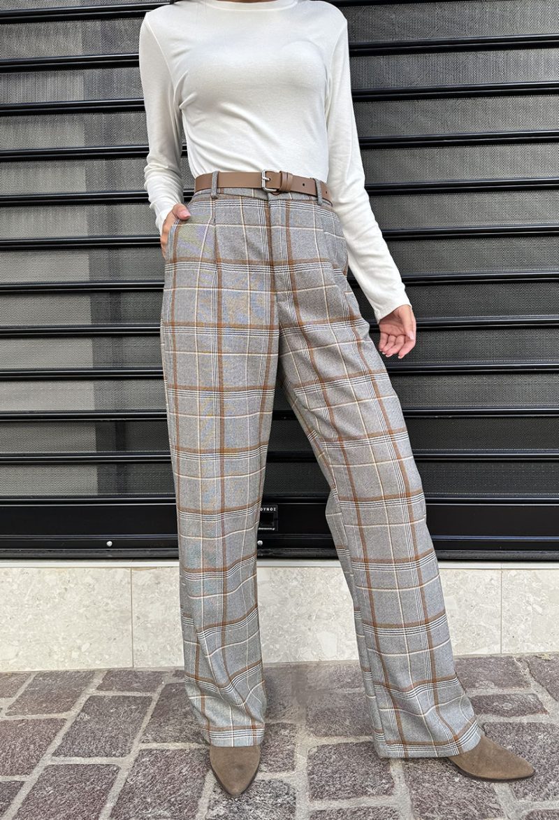 Παντελόνι με καρό σχέδιο σε light grey απόχρωση,ψηλόμεσο,ισόφαρδο με πιέτα, λάστιχο στη μέση στο πίσω μέρος, κουμπί μπροστά και τσέπες στο πλάι.