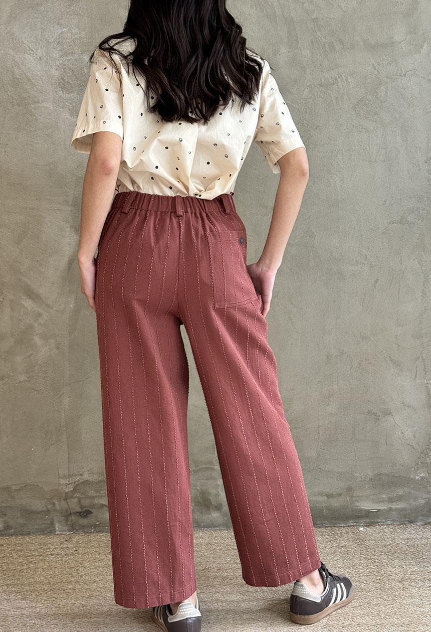 Παντελόνι σε ίσια γραμμή που στενεύει διακριτικά στο τελείωμα.Πλαινές τσέπες και λάστιχο πίσω στη μέση για τέλεια εφαρμογή,