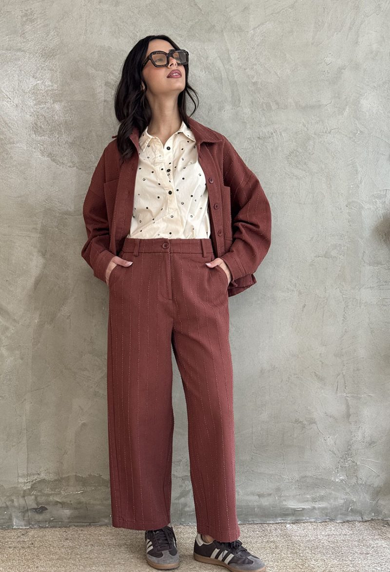 κλείνει με κουμπί και φερμουάρ.Το ριγέ βαμβακερό ύφασμα με ξέφτια χαρίζει μοντέρνα υφή και σχεδιαστικό χαρακτήρα.