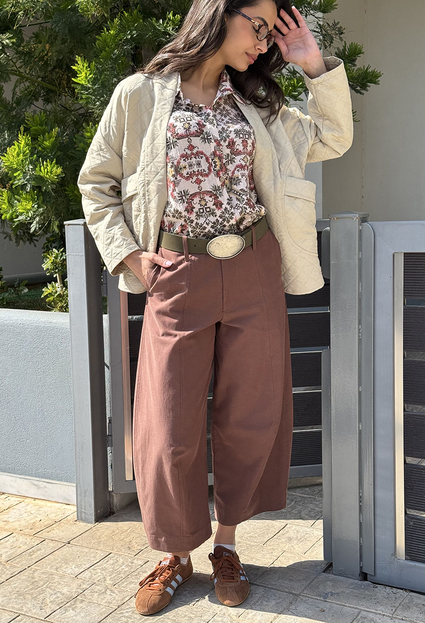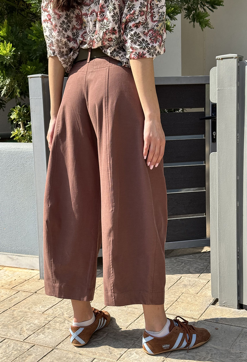 Παντελόνι cropped,σε mid waist γραμμή,baggy εφαρμογή,κρυφές τσέπες,μπροστινή ραφή,κλείνει με κουμπί και φερμουάρ.